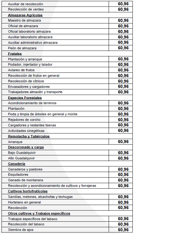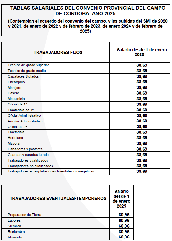 Los representantes empresariales y sindicales, miembros de la Comisión Paritaria, conforme al artículo 6 del texto legal, manifiestan que tras la publicación en el BOE el pasado 12 de febrero del Real Decreto 87/2025, de 11 de febrero, por el que se fija el salario mínimo interprofesional para 2025, los salarios en el campo en Córdoba para el año 2025, aprobados en el seno de la Comisión Negociadora y Paritaria del Convenio Colectivo del Campo, deben actualizarse con una subida del 4,41%, por lo que proceden a firmar las nuevas tablas salariales 2025.