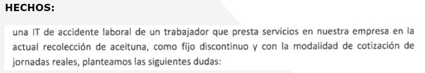 Abierta la sesión, se da lectura a la consulta presentada por SAT OLIVOS NUEVOS DE CAÑETE, S.LO, sobre la interpretación del artículo 43. INCAPACIDAD TEMPORAL en un accidente laboral.
