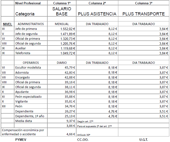 En Valencia a 30 de marzo de dos mil veintitrés, siendo las 9:30 horas, se reúnen en los locales de PYMEV, sitos en Valencia, Avenida del Cid nº 2, 4ºC, los miembros abajo relacionados de la Comisión Negociadora del Convenio Colectivo de Trabajo del Sector de Canteros, Marmolistas y Granitos Naturales de la Provincia de Valencia, con objeto de dar cumplimiento a lo previsto en el Convenio sobre revisión de la tablas salariales del año 2023 con efectos 1 de enero de 2023, reconociéndose mutuamente legitimación para la firma del presente acuerdo.