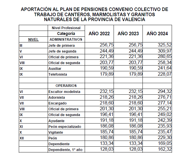 Anuncio de la Conselleria de Educación, Universidades y Empleo sobre el acta de la comisión negociadora del convenio colectivo del sector de canteros, marmolistas y granitos naturales de la provincia de Valencia, en el que se pactan las tablas con el importe de la contribución empresarial al Plan de Pensiones Sectorial para los años 2022, 2023 y 2024. Código: 46000125011982.