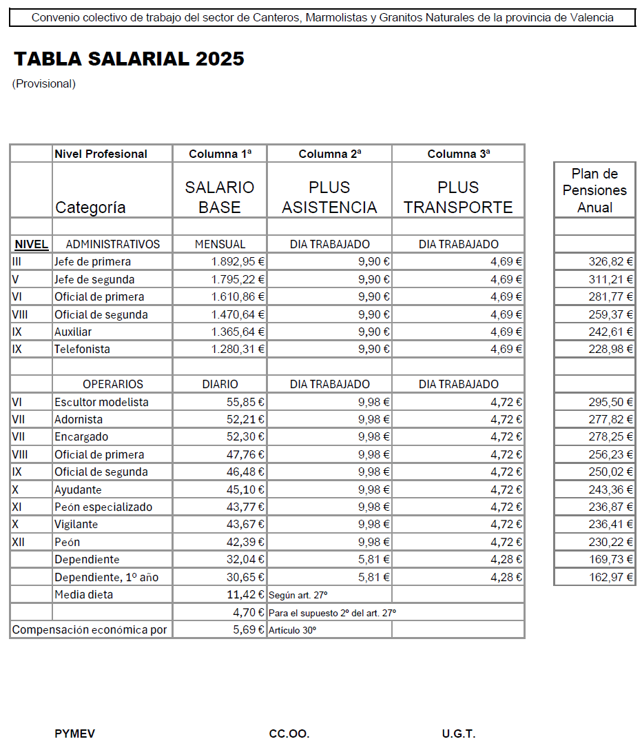En Valencia a 7 de julio de dos mil veinticinco, siendo las 12:00 horas, se reúnen en los locales de PYMEV, sitos en Valencia, Avenida del Cid nº 2, 4ºC, los miembros abajo relacionados de la Comisión Negociadora del Convenio Colectivo de Trabajo del Sector de Canteros, Marmolistas y Granitos Naturales de la Provincia de Valencia, con objeto de dar cumplimiento a lo previsto en el Convenio sobre revisión de la tablas salariales del año 2025 con efectos 1 de enero de 2025, reconociéndose mutuamente legitimación para la firma del presente acuerdo.