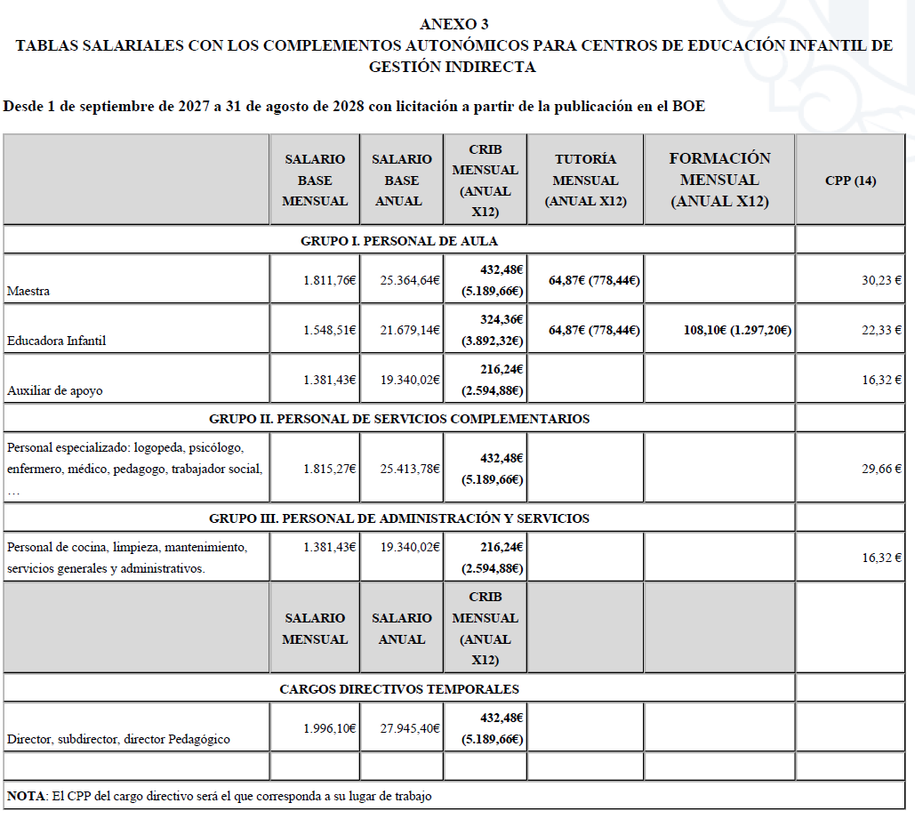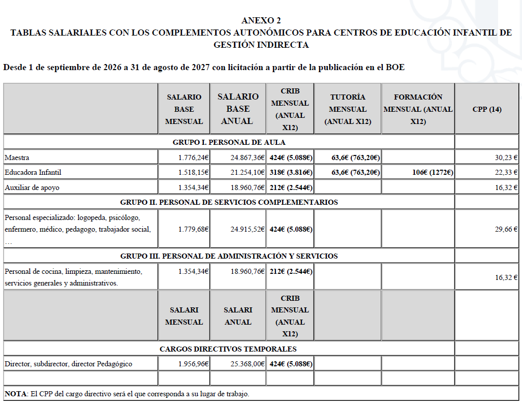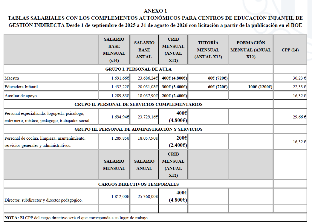 Se establece un complemento mensual autonómico, con 12 pagas anuales, que se añadirá a las mesas salariales A del XIII Convenio Colectivo de Centros de Asistencia y Educación Infantil de gestión indirecta con nuevas licitaciones desde día 1 de septiembre de 2025 y hasta 31 de agosto de 2026, con las cantidades siguientes: