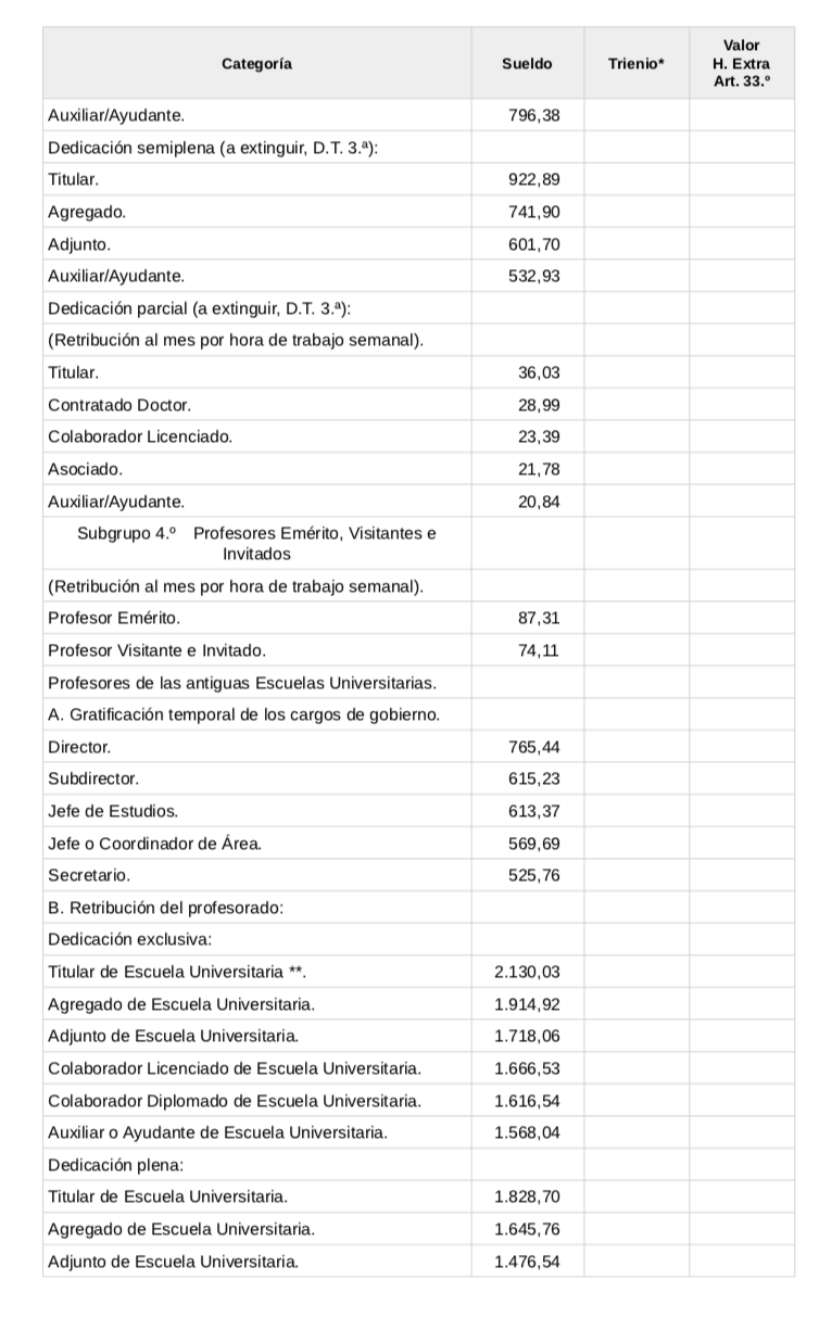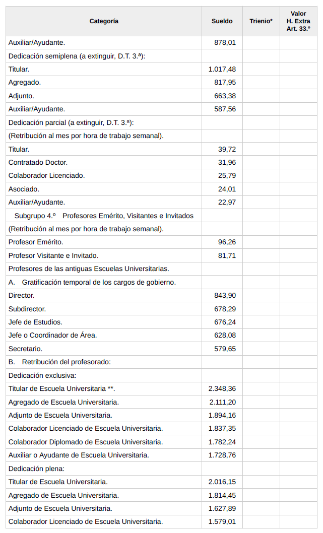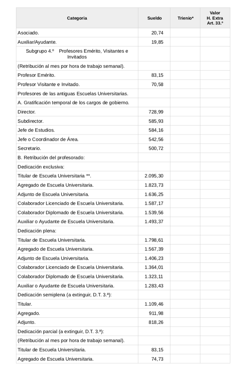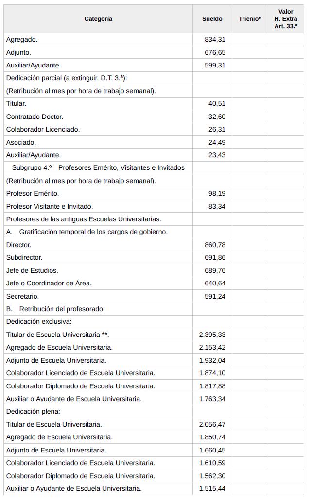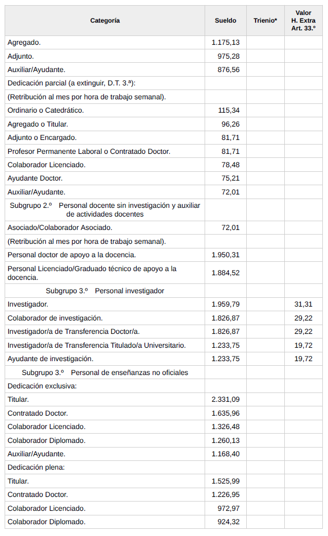 – Facultades y Escuelas Técnicas Superiores: 3,43 euros/hora.