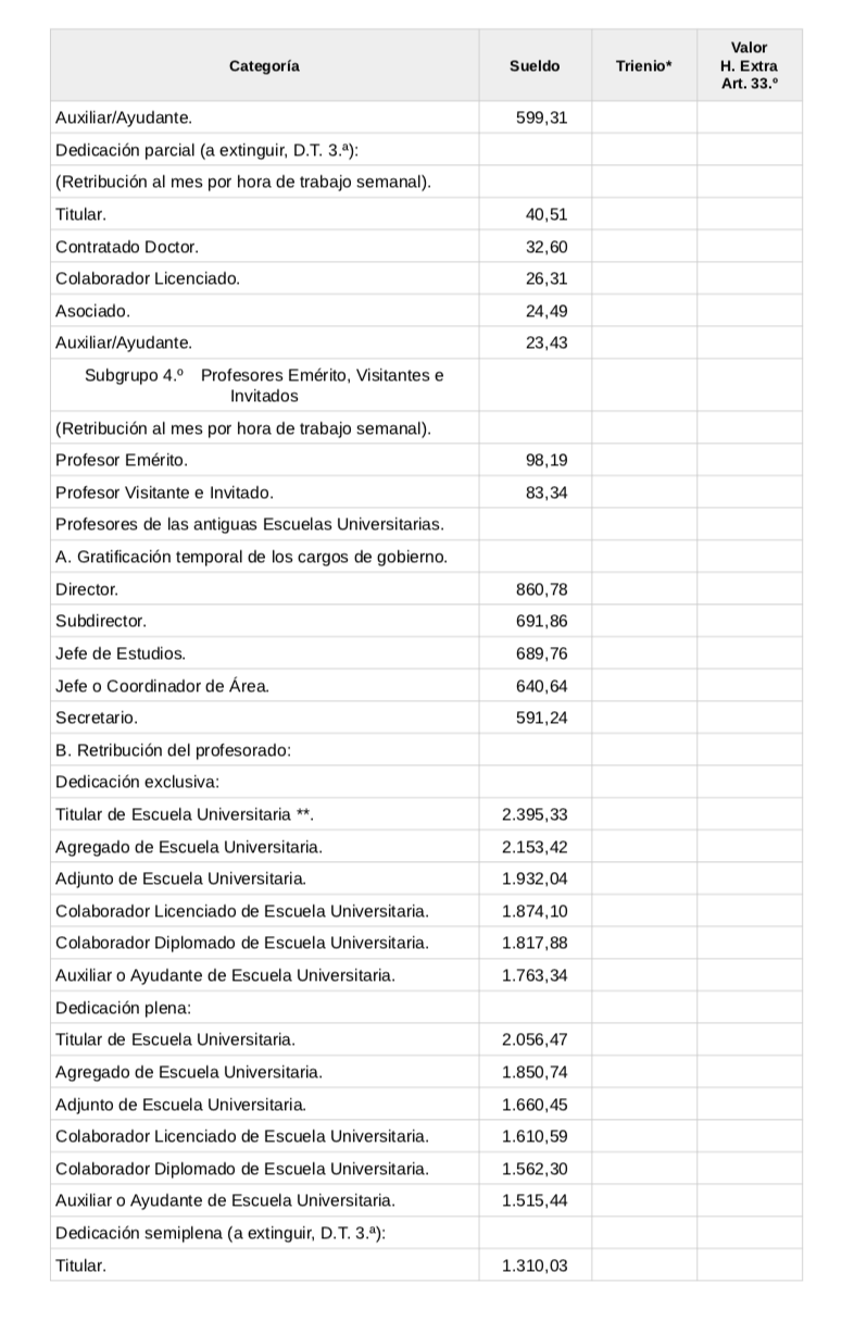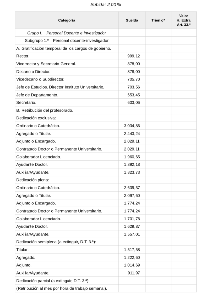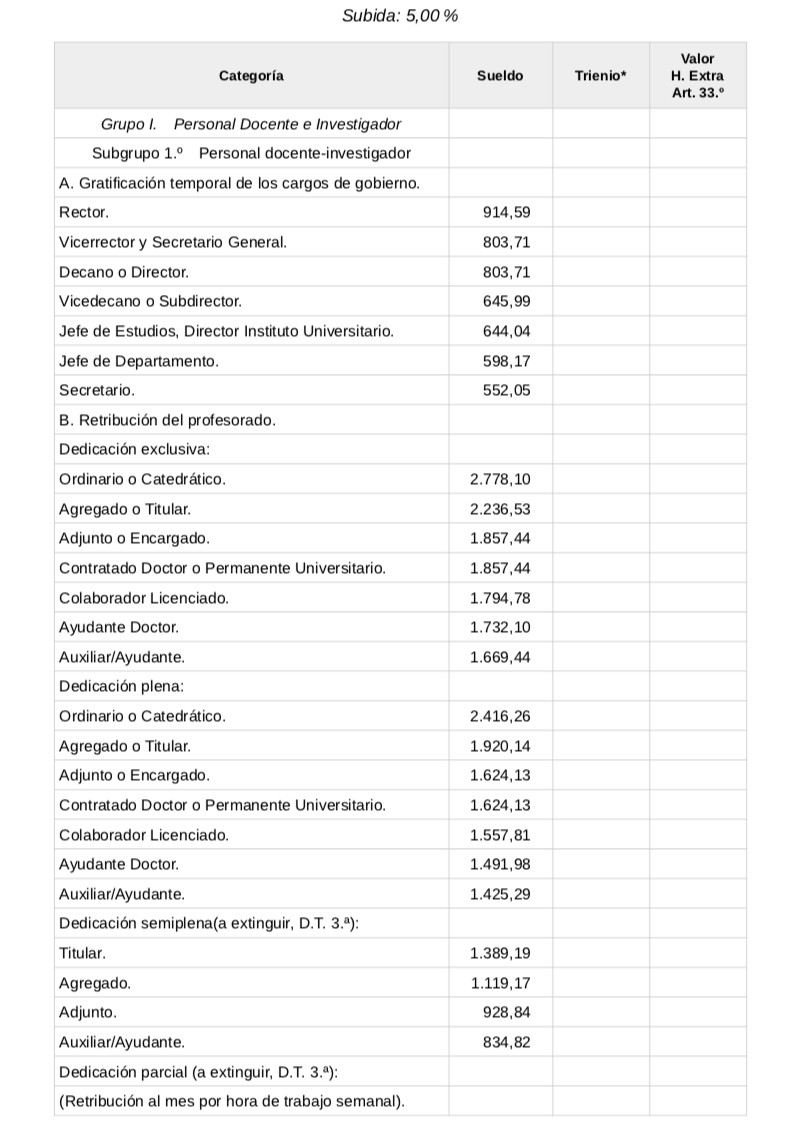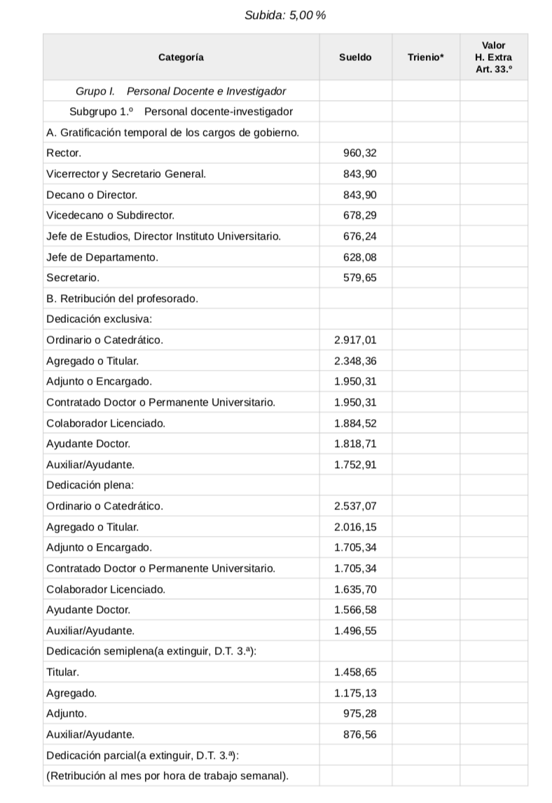 – Facultades y Escuelas Técnicas Superiores: 3,43 euros/hora.