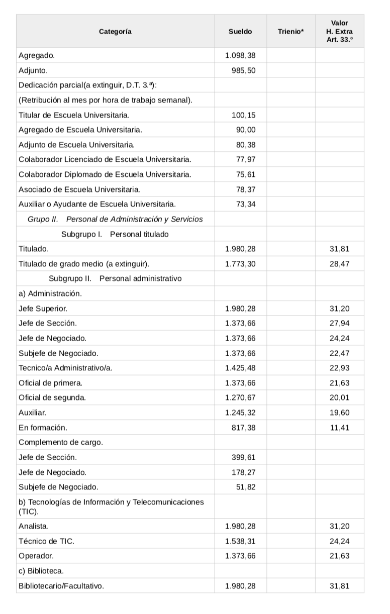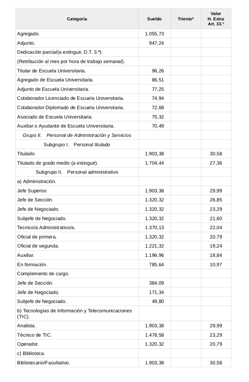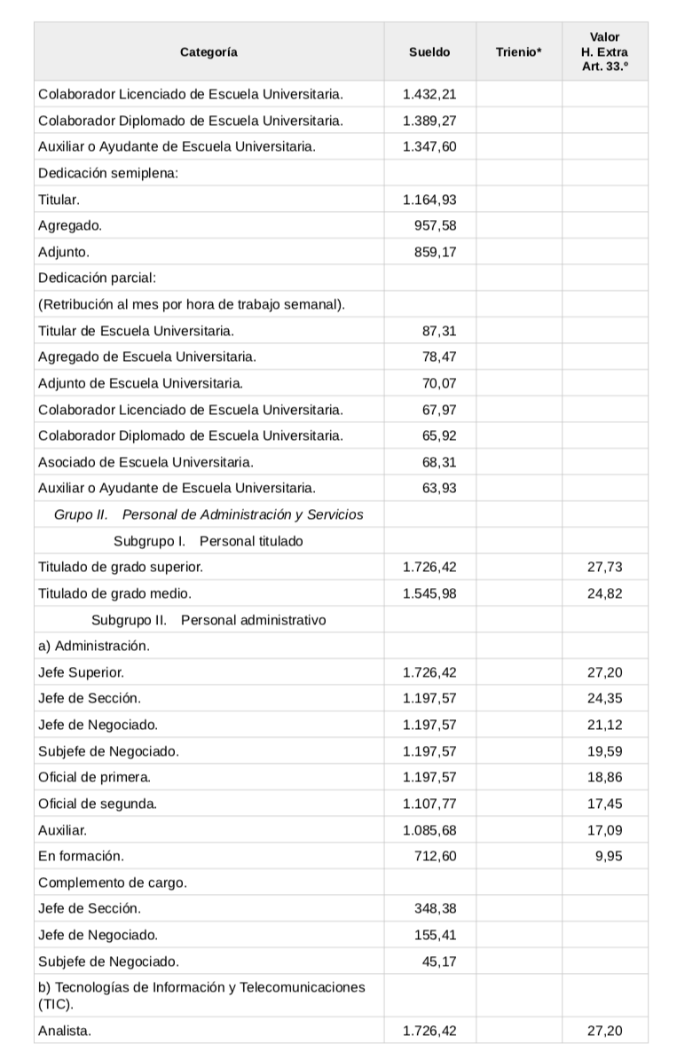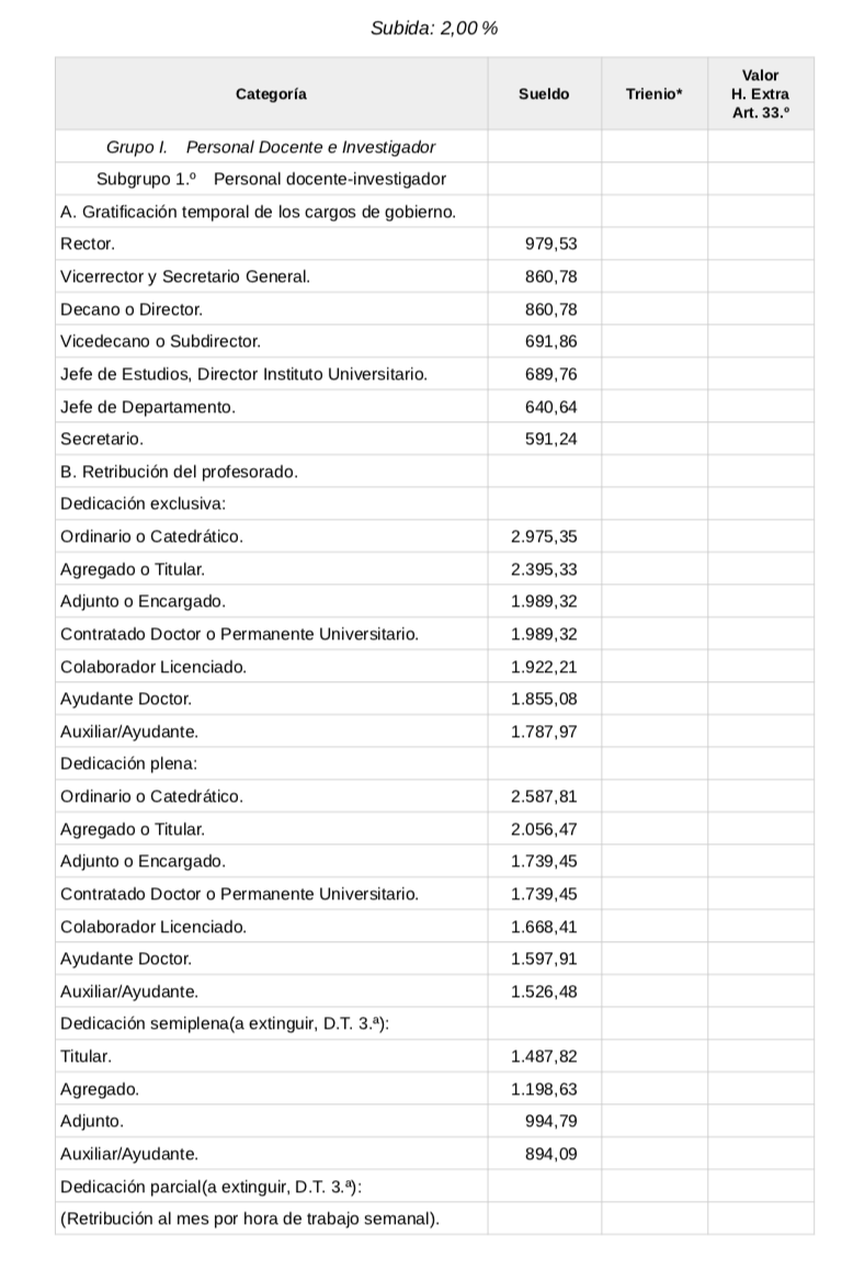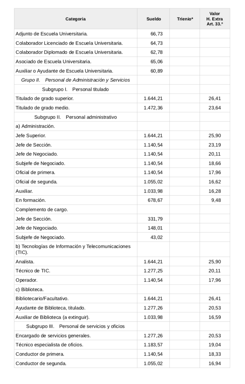 – Facultades y Escuelas Técnicas Superiores: 3,36 euros/hora.