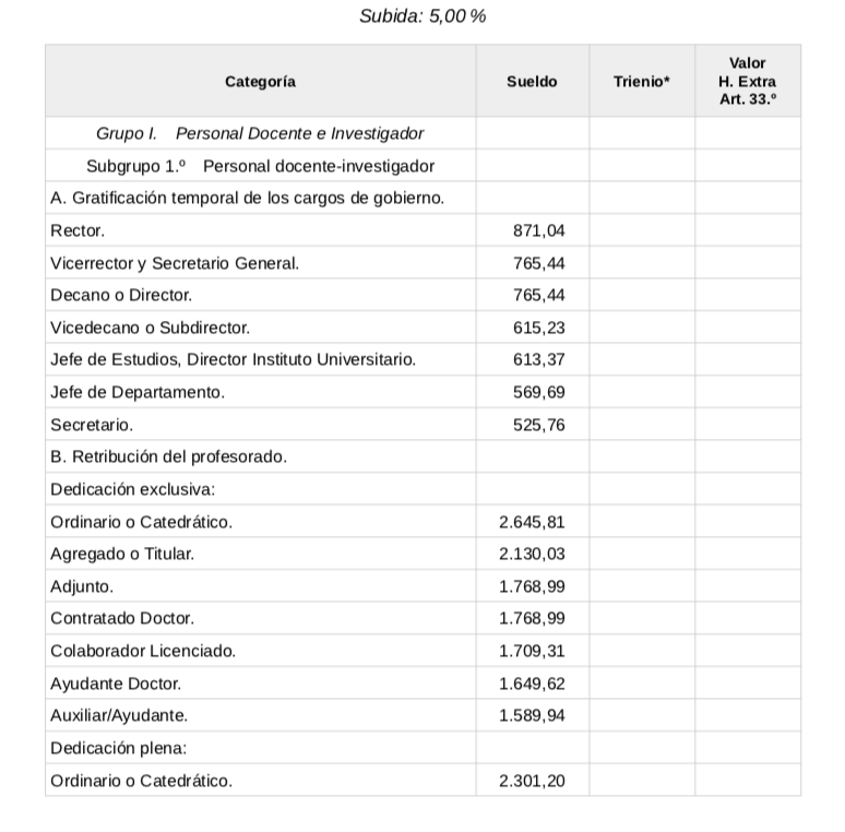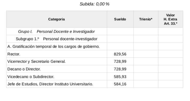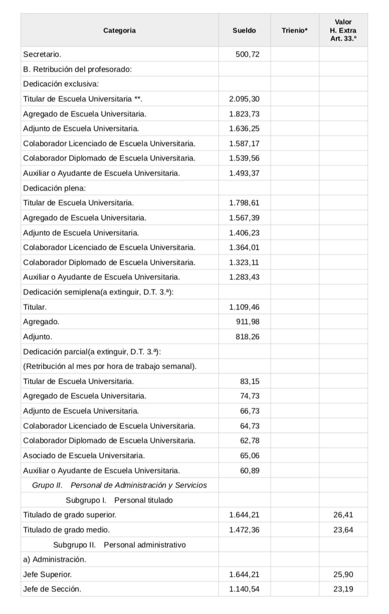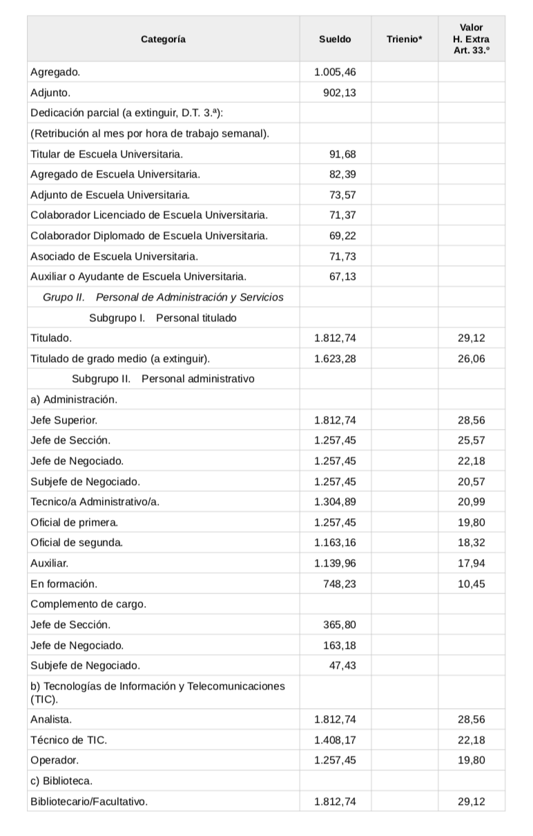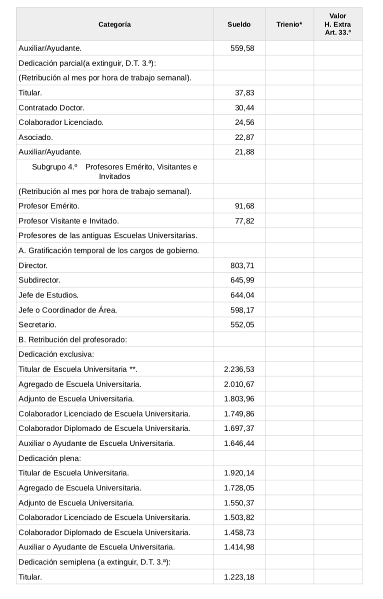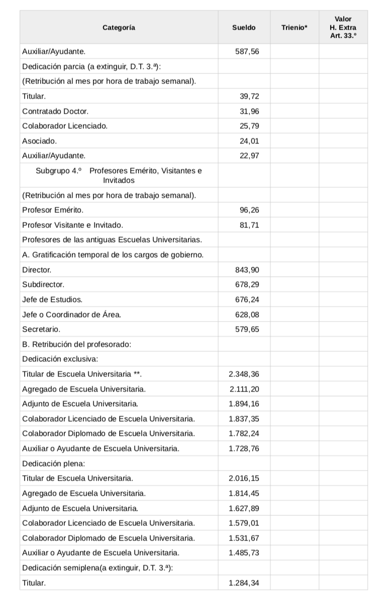 – Facultades y Escuelas Técnicas Superiores: 3,36 euros/hora.