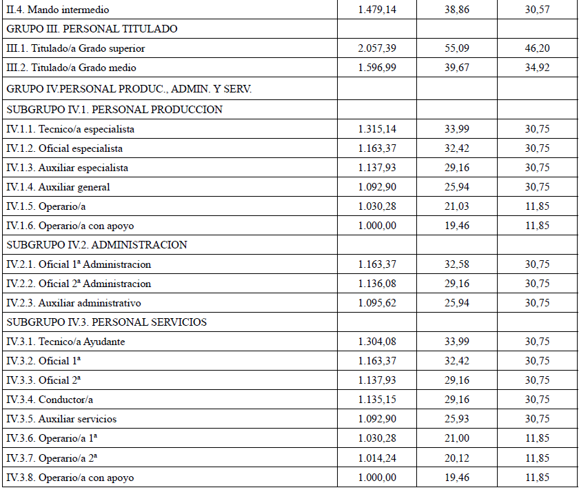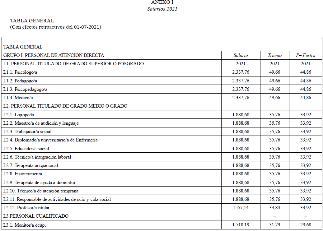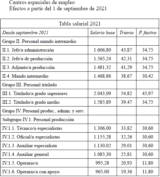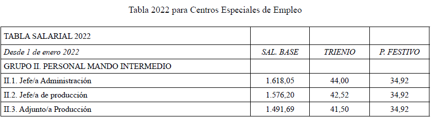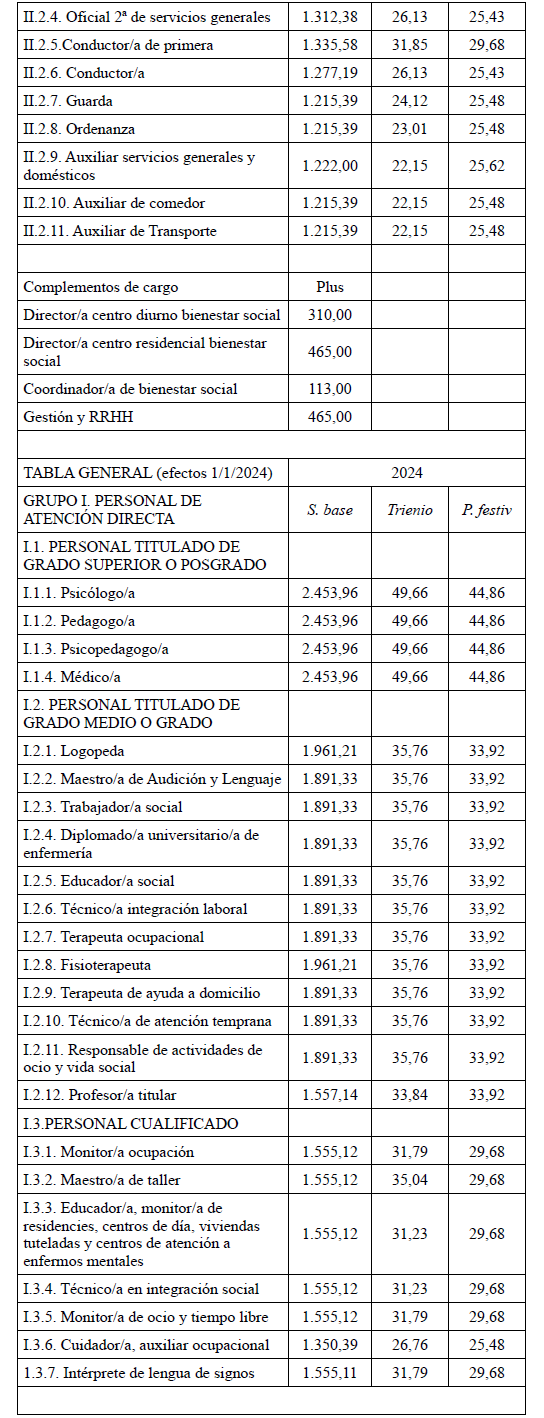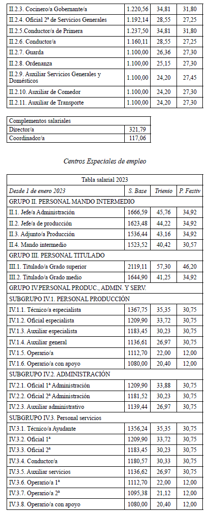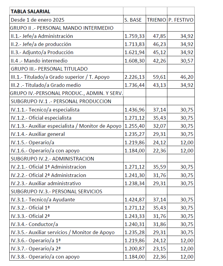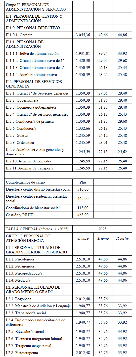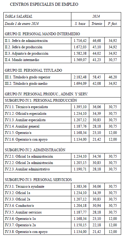 Se acuerda por parte de todas las organizaciones por unanimidad firmar la tabla salarial de 2025 para los Centros Especiales de Empleo que se adjuntan, con efectos del 1 de enero de 2025.