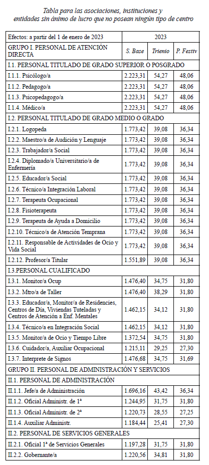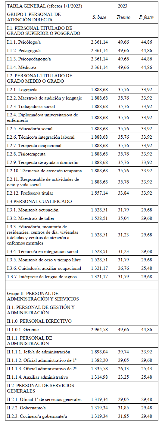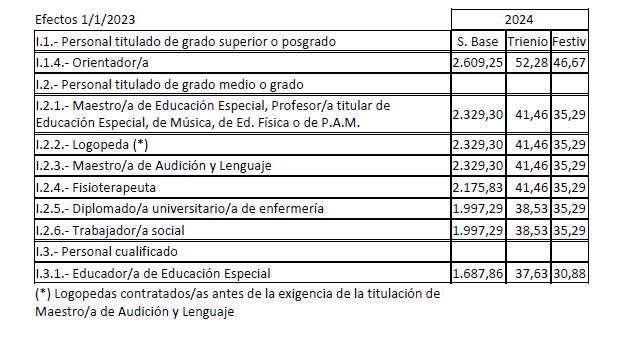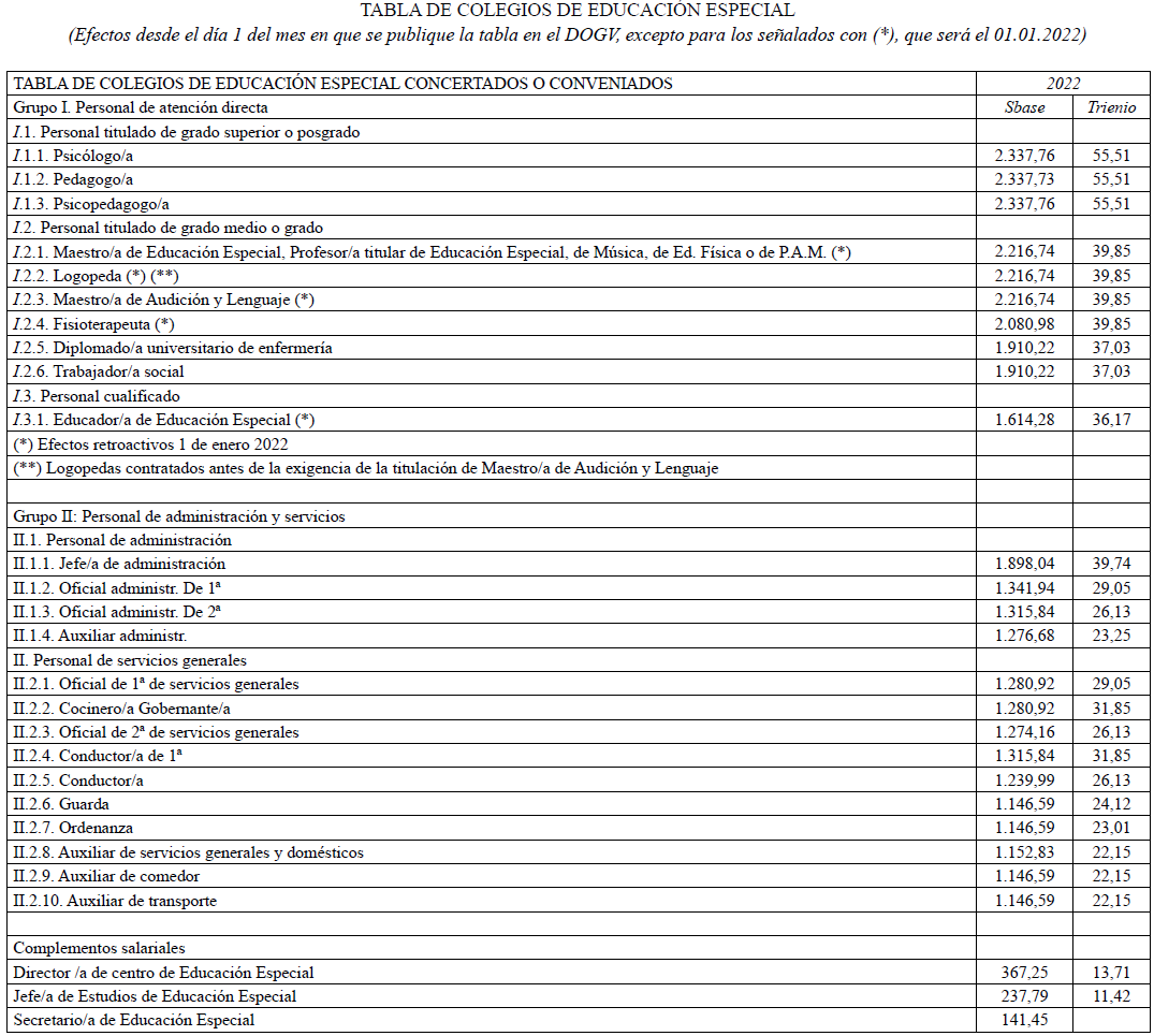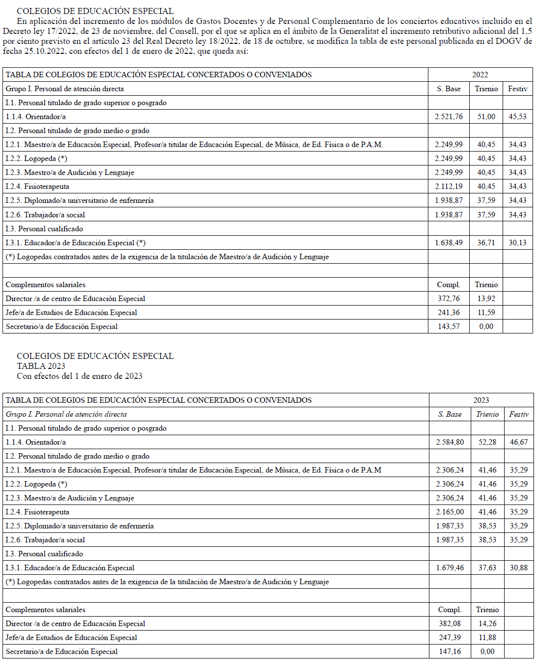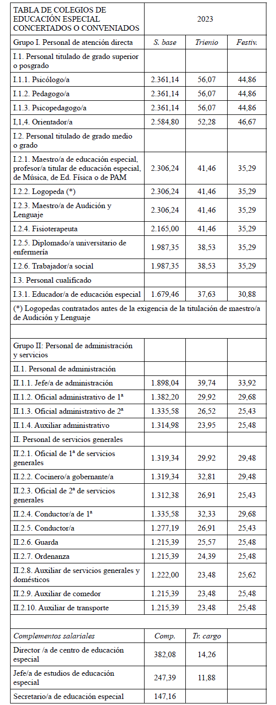 En aplicación del Acuerdo de 3 de noviembre de 2023, del Consell, por el que se acuerda la aplicación de un incremento salarial adicional en las retribuciones del personal al servicio del sector público de la Generalitat con efectos retroactivos del 1 de enero de 2023 y se actualizan las tablas retributivas (publicado en el DOGV 14/11/2023), y del Decreto-Ley 8/2024, de 2 de agosto, del Consell, de modificación de la Ley 8/2023, de 27 de diciembre, de presupuestos de la Generalitat para el ejercicio 2024 (DOGV 7/8/2024), que establecen un incremento de los módulos de los conciertos educativos con efectos del 1/1/2023, el Salario Base de las siguientes categorías queda establecido en las cuantías que aparecen a continuación, modificando las publicadas en el DOGV de fecha 16/6/2023. Este incremento tendrá efectos del 1 de enero de 2023, quedando el resto de las categorías como estaban en el DOGV mencionado: