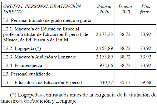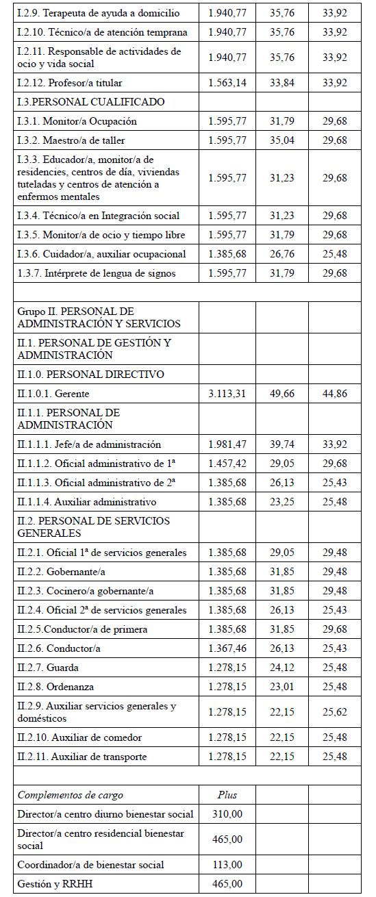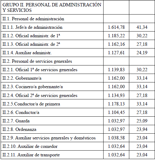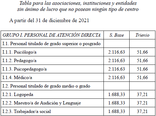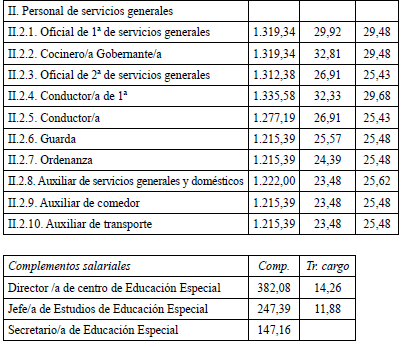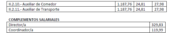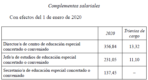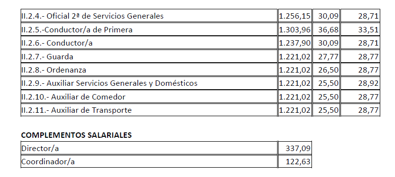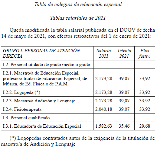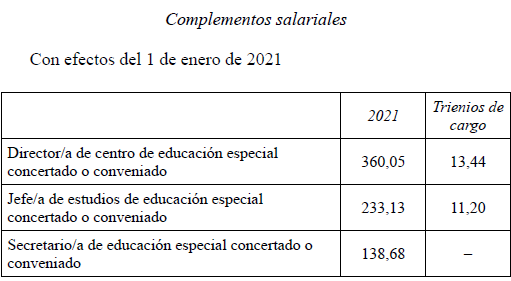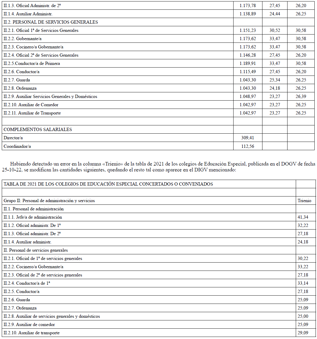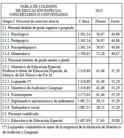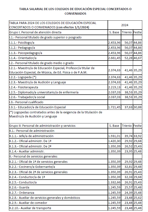 En aplicación del Acuerdo de 3 de noviembre de 2023, del Consell, por el que se acuerda la aplicación de un incremento salarial adicional en las retribuciones del personal al servicio del sector público de la Generalitat con efectos retroactivos del 1 de enero de 2023 y se actualizan las tablas retributivas (publicado en el DOGV 14/11/2023), y del Decreto-Ley 8/2024, de 2 de agosto, del Consell, de modificación de la Ley 8/2023, de 27 de diciembre, de presupuestos de la Generalitat para el ejercicio 2024 (DOGV 7/8/2024), que establecen un incremento de los módulos de los conciertos educativos con efectos del 1/1/2023, el Salario Base de las siguientes categorías queda establecido en las cuantías que aparecen a continuación, modificando las publicadas en el DOGV de fecha 16/6/2023. Este incremento tendrá efectos del 1 de enero de 2023, quedando el resto de las categorías como estaban en el DOGV mencionado: