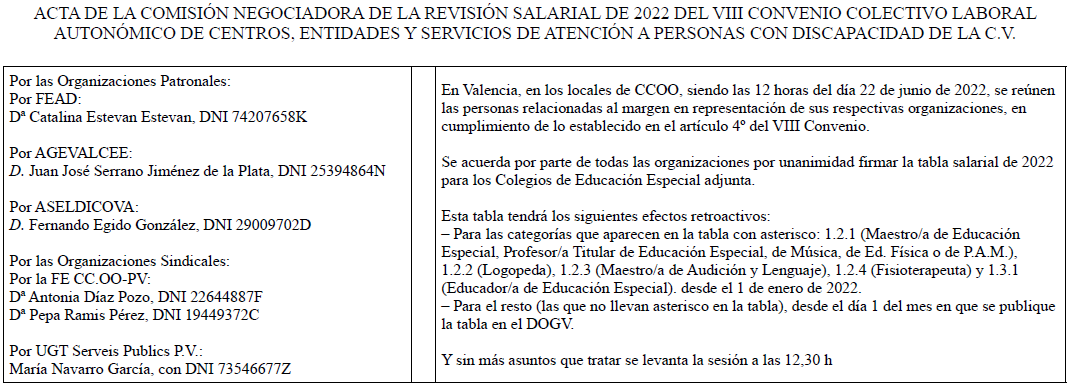 La Comisión Paritaria del VIII Convenio colectivo laboral autonómico de centros, entidades y servicios de atención a personas con discapacidad de la Comunitat Valenciana, reunida el 19 de abril de 2024, ante las numerosas consultas recibidas por esta Comisión sobre la situación creada como consecuencia de la notificación de fecha 17/4/2024 recibida por las entidades por parte de la Conselleria de Servicios Sociales, Igualdad y Vivienda, donde se establecen unos importes inferiores a los acordados para la aplicación de las tablas salariales del Acuerdo Interprofesional de mejora de las condiciones de trabajo de las personas profesionales del Sistema Público Valenciano de Servicios Sociales en el ámbito de la acción concertada y del Acuerdo Interprofesional de mejora de las condiciones de trabajo del personal de los centros de titularidad propia del Sistema Público Valenciano de Servicios Sociales gestionados mediante contrato público, publicadas en el DOGV núm. 9607, de 31 de mayo de 2023, y modificadas en el DOGV del 31 de julio de 2023, negociadas como consecuencia de los acuerdos firmados el 17 de noviembre de 2022 por los agentes sociales y la Administración valenciana, ha acordado que los centros o empresas de atención especializada incluidos en el apartado A) del artículo 2 del VIII Convenio Colectivo Laboral Autonómico de centros, entidades y servicios de atención a personas con discapacidad de la Comunidad Valenciana deben aplicar como mínimo la tabla general del citado convenio publicada en el DOGV núm. 9617, de fecha 14 de junio de 2023, con efectos retroactivos del 1 de enero de 2023 y 2024, respectivamente, hasta el momento en que la Conselleria correspondiente desarrolle los incrementos de los módulos económicos acordados que permitan aplicar las tablas de dichos acuerdos interprofesionales.