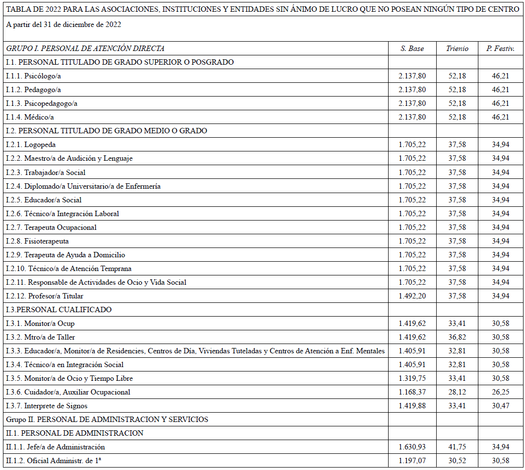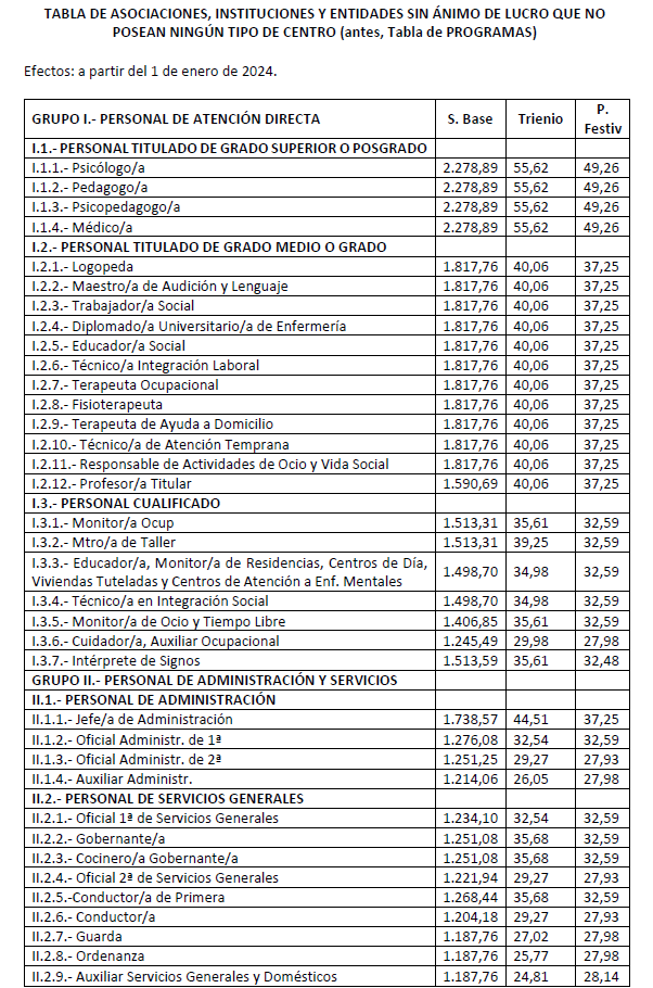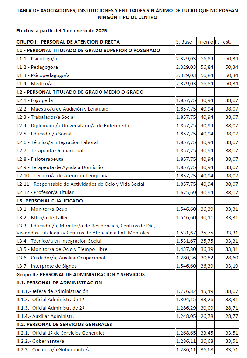 Se acuerda por parte de todas las organizaciones por unanimidad firmar la tabla salarial de 2025 para las Asociaciones, Instituciones y Entidades sin ánimo de lucro que no posean ningún tipo de dentro (tabla de Programas), con efectos del 1 de enero de 2025.