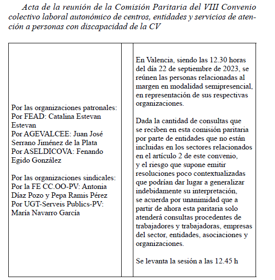 ACTA DE LA COMISIÓN PARITARIA DEL VIII CONVENIO COLECTIVO LABORAL AUTONÓMICO DE CENTROS, ENTIDADES Y SERVICIOS DE ATENCIÓN A PERSONAS CON DISCAPACIDAD DE LA CV.