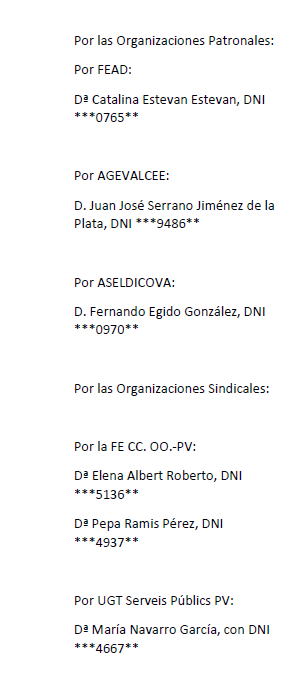 En València, en los locales de CCOO, siendo las 11.00 horas del día 19 de abril de 2024, se reúnen de modo presencial las personas relacionadas al margen en representación de sus respectivas organizaciones. El representante de ASELDICOVA justifica su ausencia.