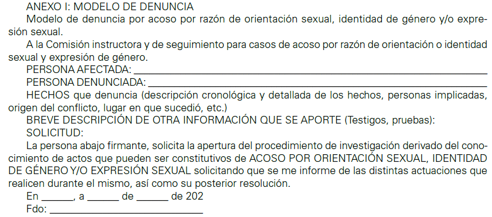 En el ámbito de (NOMBRE DE LA EMPRESA) no se permitirán ni tolerarán conductas que puedan ser constitutivas de acoso por razón de orientación o identidad sexual y expresión de género, en cualquiera de sus manifestaciones. La empresa sancionará tanto a quien incurra en una conducta ofensiva como a quien la promueva, fomente y/o tolere. De entender que está siendo acosada, cualquier persona trabajadora dispondrá de la posibilidad de, mediante queja o denuncia, activar este protocolo como procedimiento en aras a su erradicación y reparación.