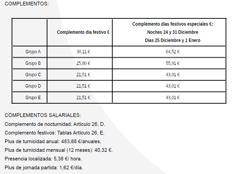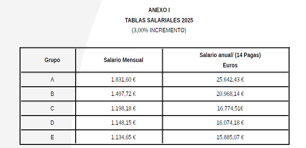 Nota: En todo caso para cada trabajador/a la suma del salario base y los complementos salariales contenidos en las tablas salariales tendrán que alcanzar como mínimo el Salario Mínimo Interprofesional para 2.025. En caso contrario se incluirá un complemento salarial hasta alcanzar la citada cantidad.