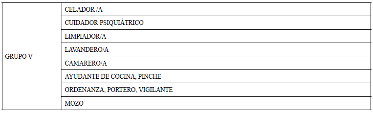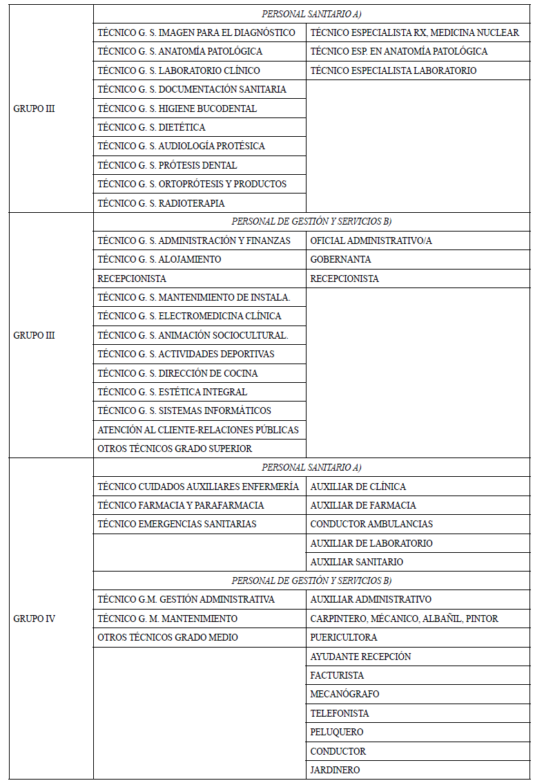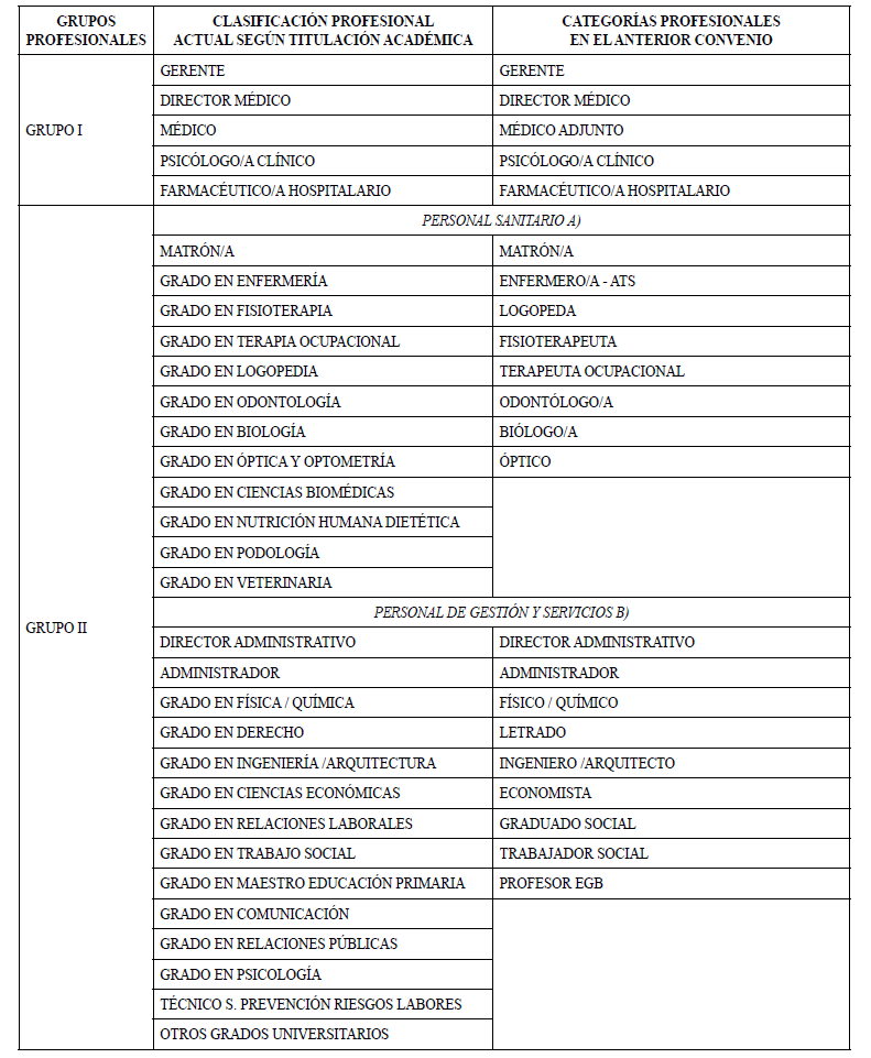 En la disposición adicional tercera, se aprueba una tabla de equivalencia, la cual se aporta como anexo I para el personal sanitario y el personal no sanitario, incardinando cada titulación profesional actual en el grupo al que pertenezca, y estableciendo asimismo la incardinación en cada grupo de las categorías profesionales que aparecían en antiguos convenios colectivos que ya quedaron derogados.