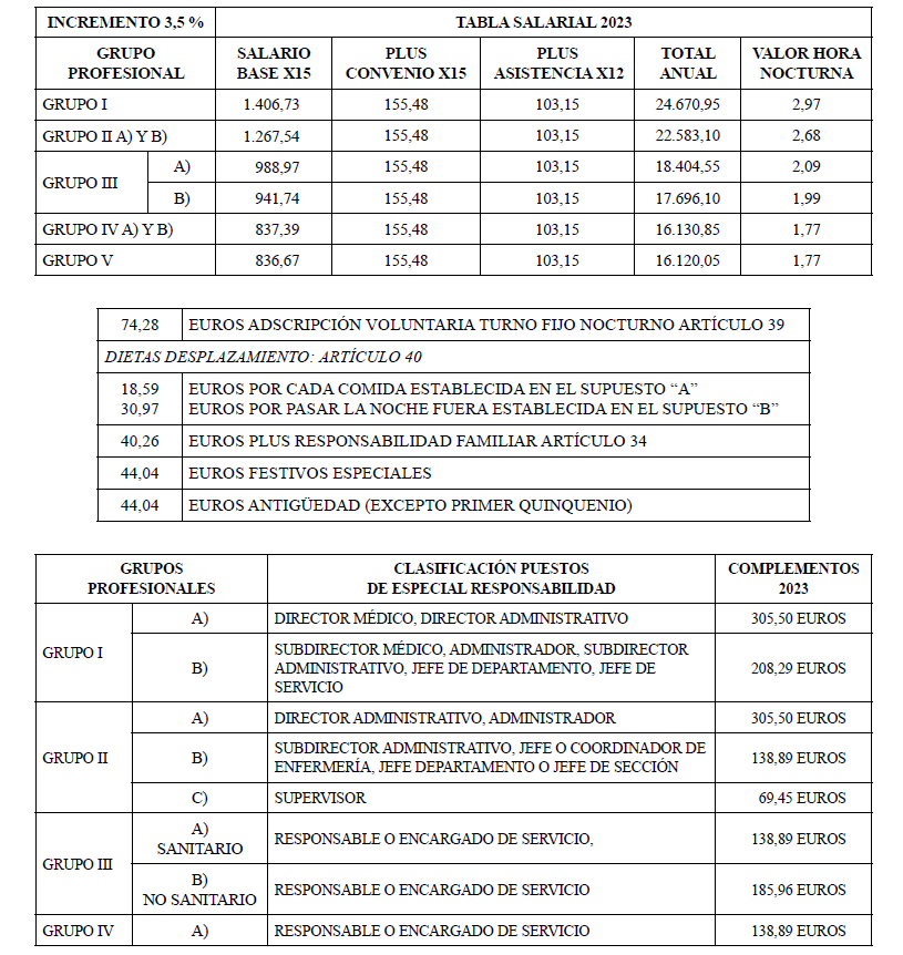 La revisión salarial general para el año natural 2023 será del 3,5 % sobre los salarios aprobados para 2022, aplicable sobre todos los conceptos salariales contemplados en este convenio en cifras (no así los contemplados en un porcentaje, porcentaje que se mantendrá inalterable). En los artículos correspondientes de este convenio colectivo y en las tablas salariales adjuntas ya viene incluida esa revisión salarial del 3,5 %. En los grupos IV y V la revisión del salario base ha sido superior a ese porcentaje, resultado de incrementar a esa revisión general una cantidad bruta anual de 135 euros.