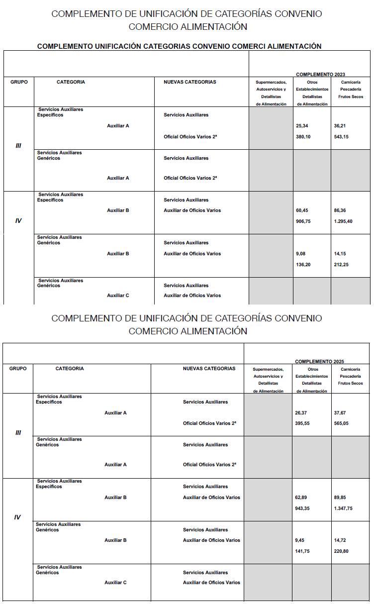 Se incorpora al artículo 12.º complementos salariales, un nuevo complemento denominado «Complemento de unificación de categorías» con el siguiente contenido: «Con el objeto de aplicar los incrementos establecidos en el artículo 9.º del convenio y dar cumplimiento a los acuerdos alcanzados, se aplicará al personal que estuviera contratado antes de la publicación de este convenio, en las categorías unificadas que provengan de las antiguas categorías: auxiliar A y B de servicios auxiliares específicos y auxiliar A, B y C de servicios auxiliares genéricos y que, como consecuencia de la unificación de categorías hayan visto mermada su retribución, durante los años 2021 a 2025, los complementos salariales detallados en el anexo I que se incorpora al acta.