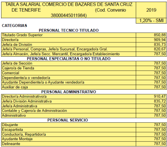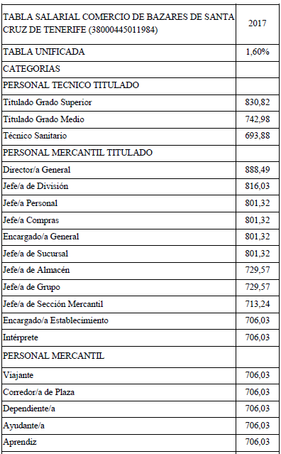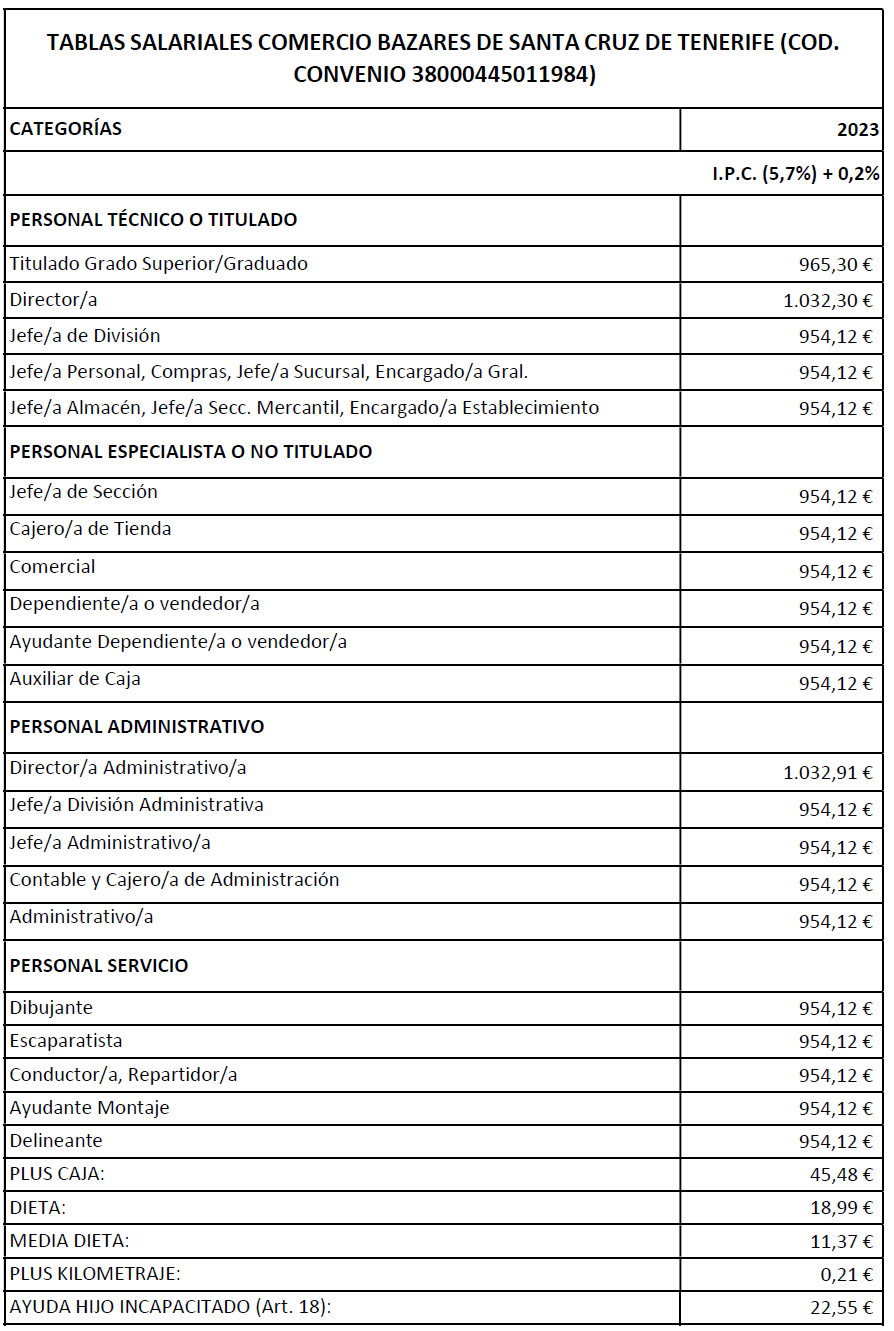 Por tanto, la tabla salarial del Convenio de Comercio de Bazares para la Provincia de Santa Cruz de Tenerife para el año 2023 se adjuntan al presente acuerdo es la que se señala.