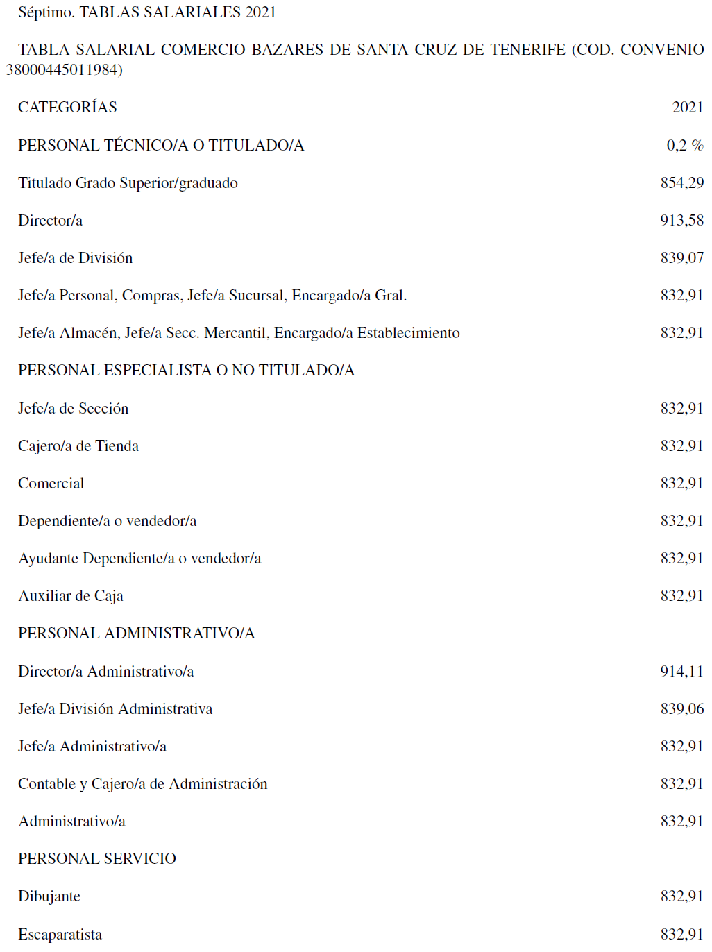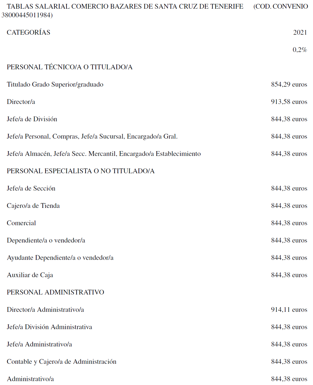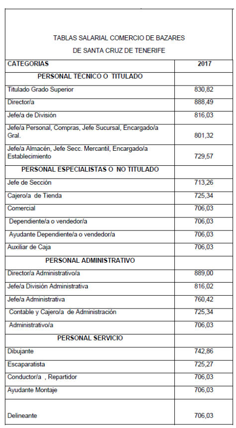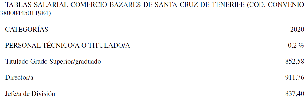 Por tanto, la tabla salarial con las categorías determinadas del Convenio de Comercio de Bazares para la Provincia de Santa Cruz de Tenerife para los años 2020 y 2021 es la que se señala, quedando esta para determinar la base de los salarios para los años siguientes.