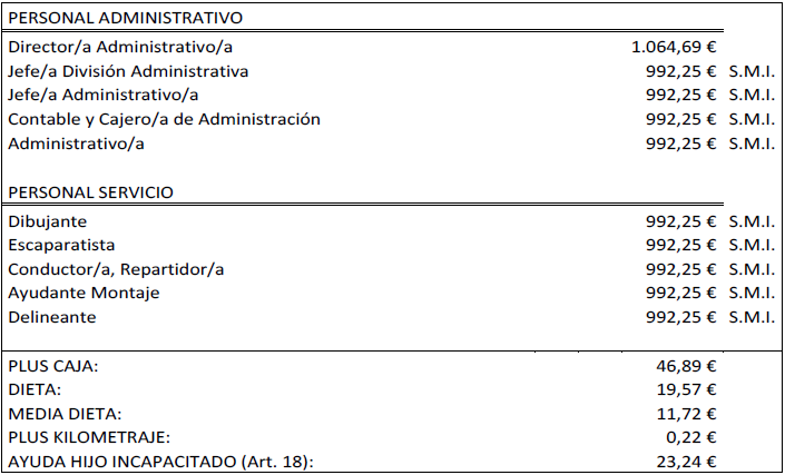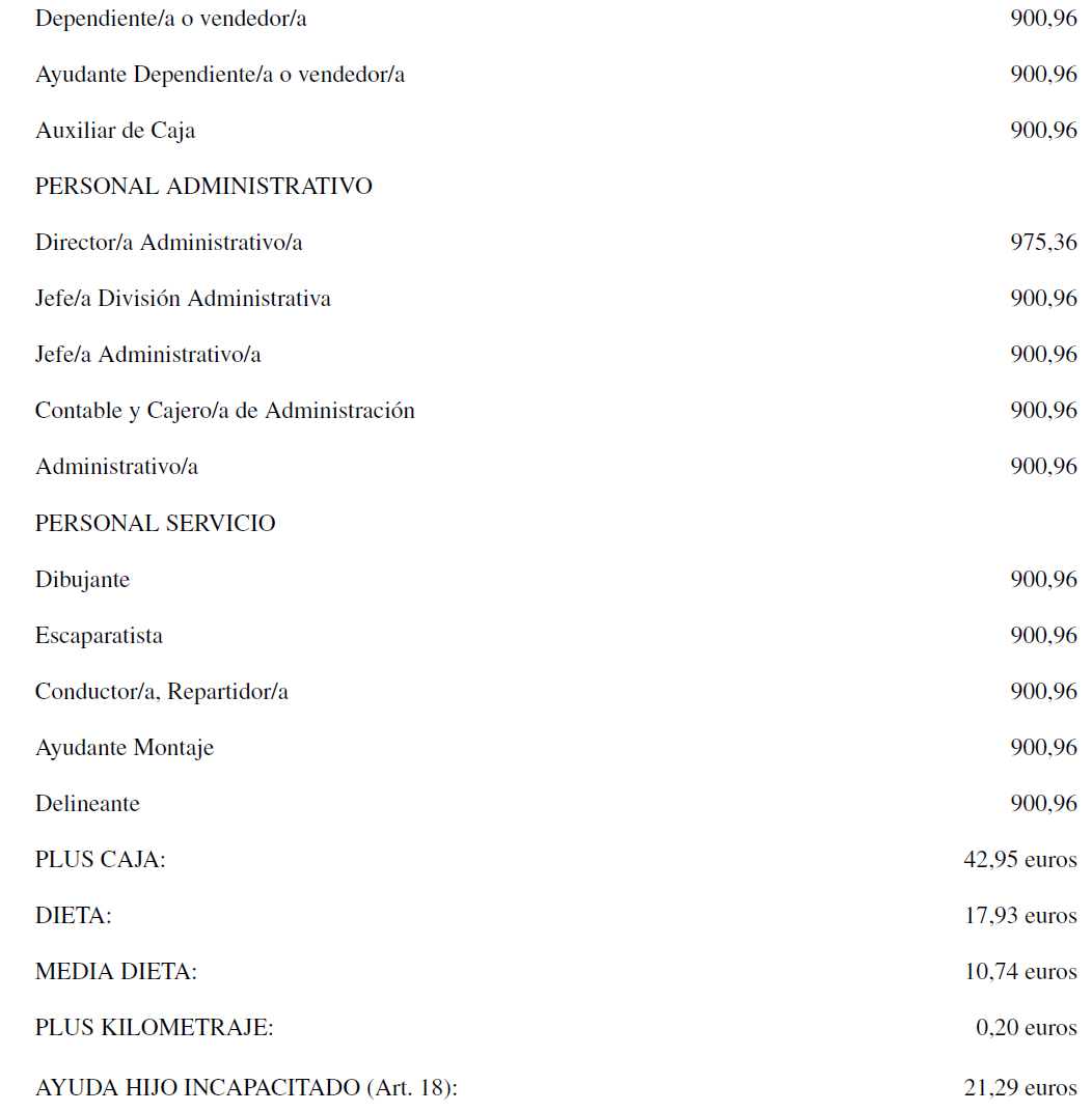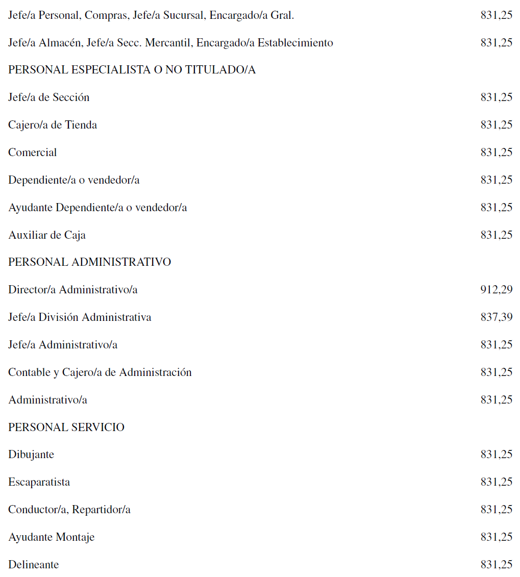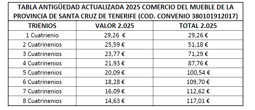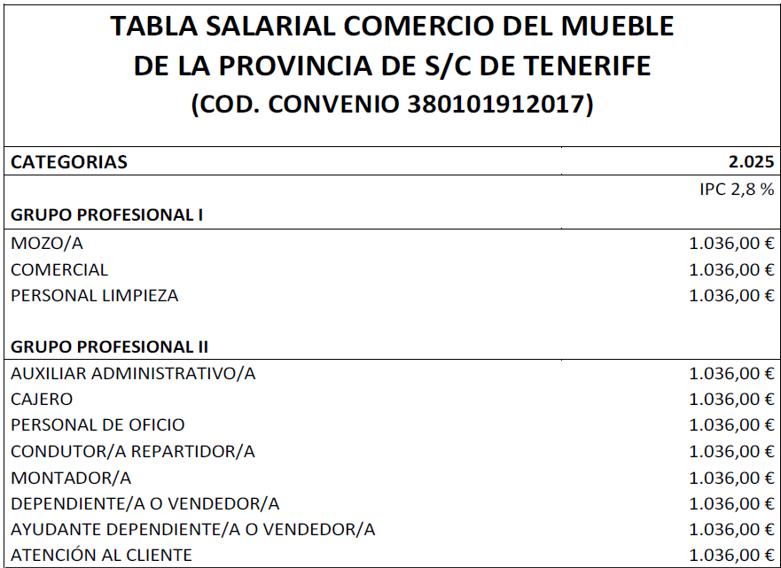 Por tanto, la tabla salarial con las categorías determinadas del Convenio de Comercio del Mueble para la Provincia de Santa Cruz de Tenerife año para el año 2025 es la que se señala, quedando esta para determinar la base de los salarios para los años siguientes.