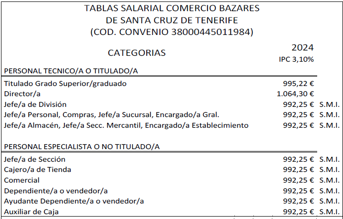 Por tanto, la tabla salarial con las categorías determinadas del Convenio de Comercio de Bazares para la Provincia de Santa Cruz de Tenerife para el 2024 es la que se señala, quedando esta para determinar la base de los salarios para los años siguientes.