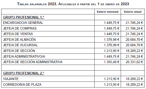 Se establece para el año 2023 el nuevo salario de convenio que para cada categoría profesional figura en la tabla salarial que se incorpora como anexo I, resultante de activar los efectos económicos desde el 1 de enero de 2023, de las tablas salariales definitivas resultantes de la revisión salarial prevista en el artículo 9 del convenio 2019-2022 (6,5%), incrementadas en la cantidad anual de 878,12 euros (equivalente al plus extrasalarial de transporte urbano de 2022 revisado en un 6,5% previsto en el artículo 13 del convenio para 2019-2022, que desaparece con efectos de 31-12-2022), salvo para el complemento ad personam de antigüedad que se revalorizará con el IPC real del año 2022.
