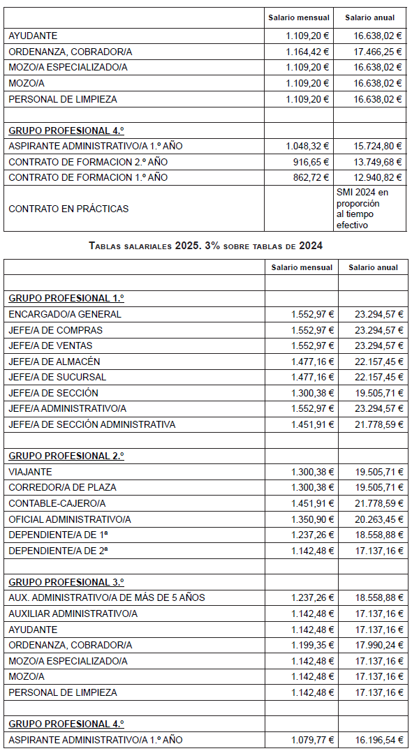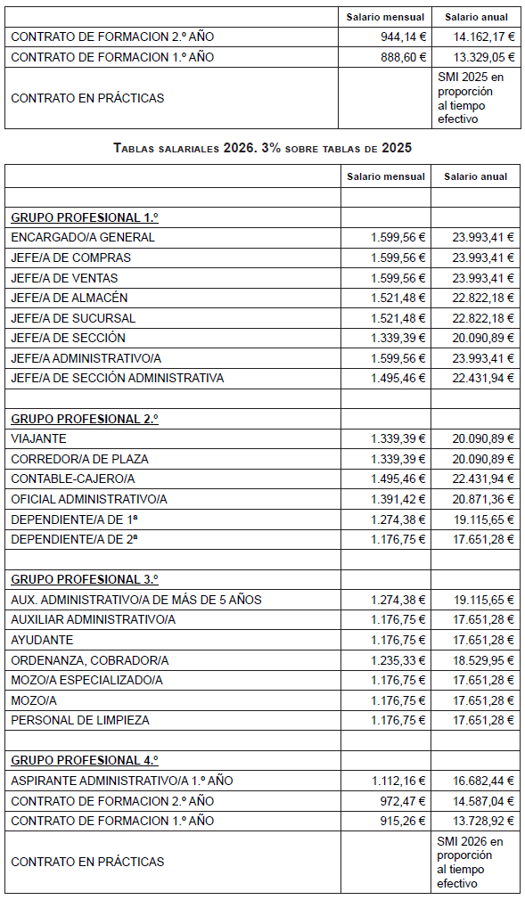 Ayudantes: Aquellos trabajadores/as que a 1 de enero de 2023 ostenten la categoría profesional de ayudante dentro del grupo profesional 3.º; y que acrediten al menos tres años de cumplimiento efectivo en la categoría de los requisitos anteriormente enunciados, serán promocionados de forma automática al grupo profesional 2.º con la categoría de dependiente/a de 2.ª.