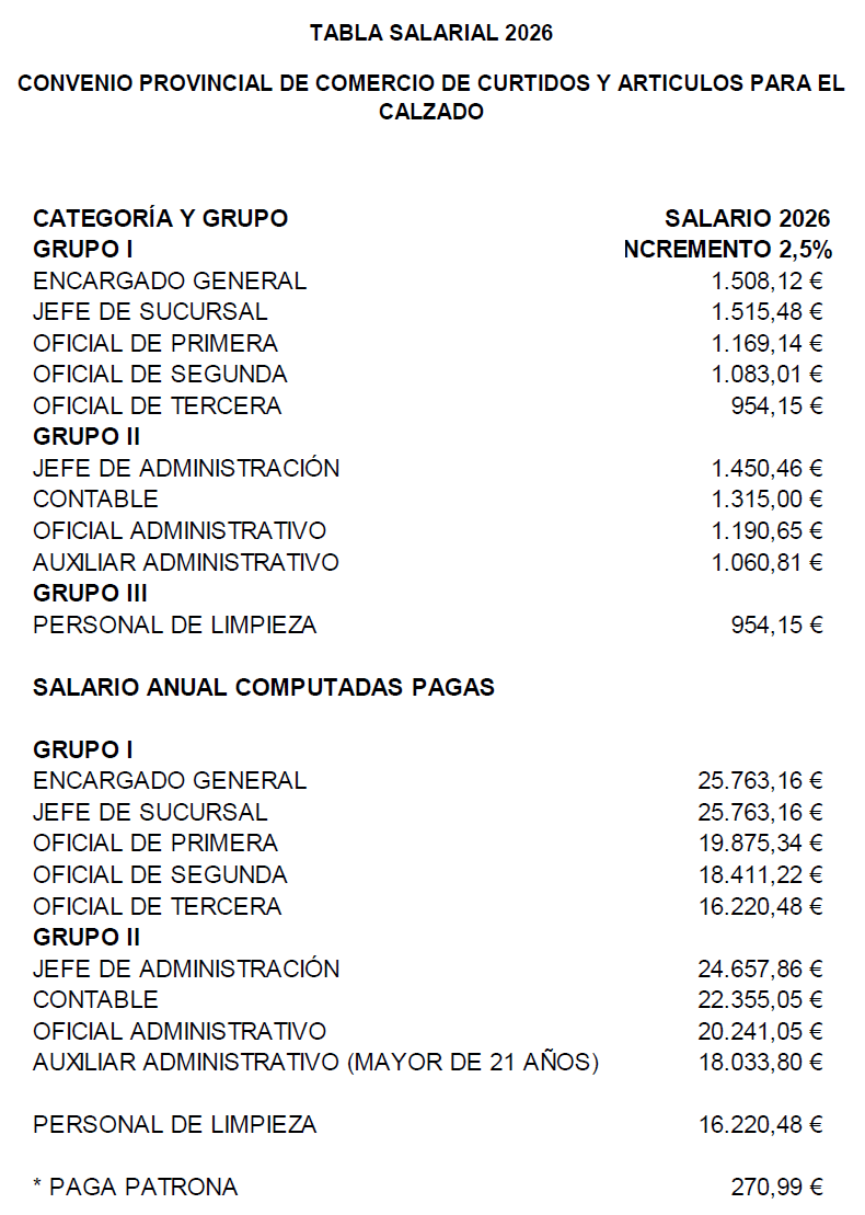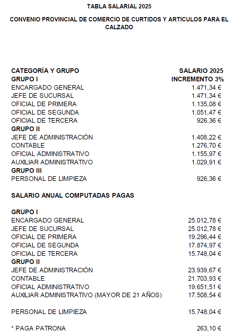 I. Con fecha 31/03/2025 se remitió al Registro de Convenios de Alicante texto nuevo del convenio colectivo para el Comercio de Curtidos y Artículos para el Calzado de la provincia de Alicante. Dicho convenio ha sido suscrito, por la parte empresarial, por la Asociación Española de Empresas de Componentes y Maquinaria para el Calzado y la Marroquinería (AEC) y, por la parte social, por las Centrales Sindicales UGT-PV y CCOO-PV.
