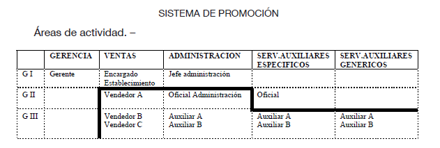 La subida de nivel profesional se producirá exclusivamente dentro del grupo profesional en el que se encuentre el trabajador, con las únicas excepciones de las áreas de venta y administración, en las que se podrá promocionar del grupo III al grupo II, sin que sea necesario en este caso un cambio de las funciones desempeñadas.