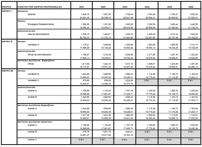 Para los años 2021, 2022, 2023, 2024, 2025 y 2026, los salarios pactados son los que se reflejan en las tablas salariales adjuntas, resultando de aplicar a las precedentes los siguientes porcentajes de incremento 2021 (0%), 2022 (2,50%), 2023 (2,50%), 2024 (2%), 2025 (2%) y 2026 (2%).