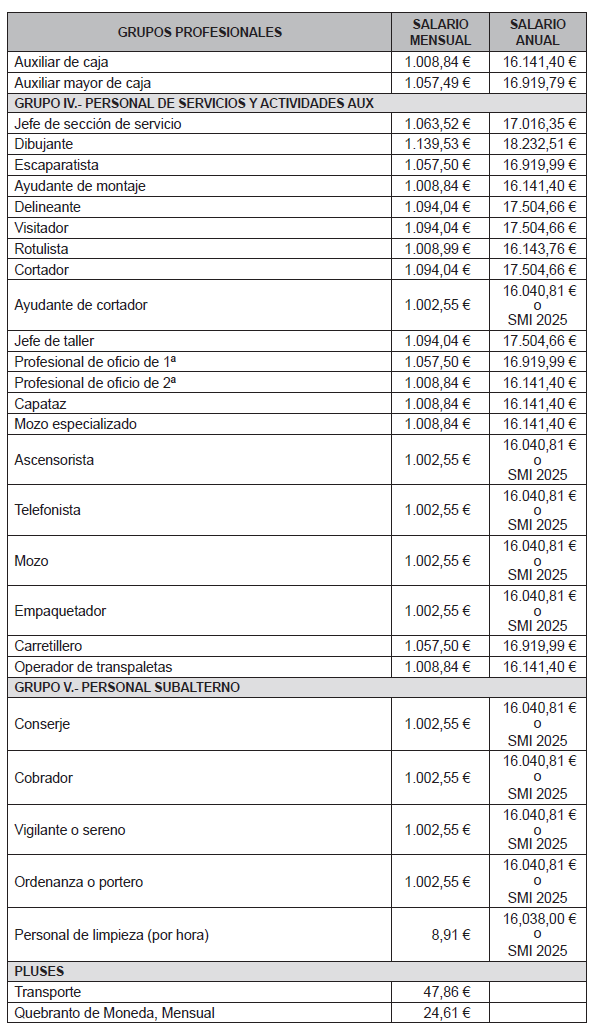La empresa que exija determinada uniformidad a sus trabajadores/as y no les facilite la ropa y/o calzado precisos abonará a los trabajadores afectados la cantidad mensual de 23,66 euros mensuales para el año 2021, 24,14 euros mensuales para el año 2022, 25,10 euros mensuales para el año 2023, 25,86 euros mensuales para 2024 y 26,64 euros mensuales para 2025.