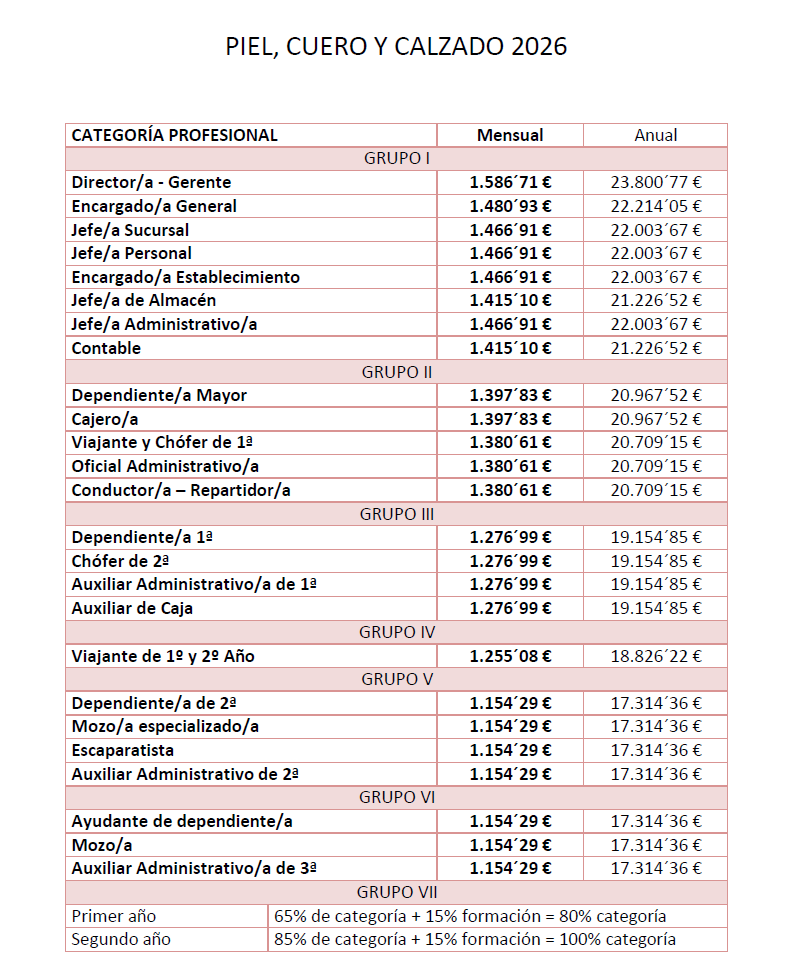 PRIMERO. – Se procede a la actualización de las tablas salariales del año 2026 prevista en el artículo 11 del Convenio Colectivo del Comercio de la Piel, Cuero y Calzado de Cantabria, para ello se incrementan las vigentes a 31 de diciembre de 2025 en un 2,9%.