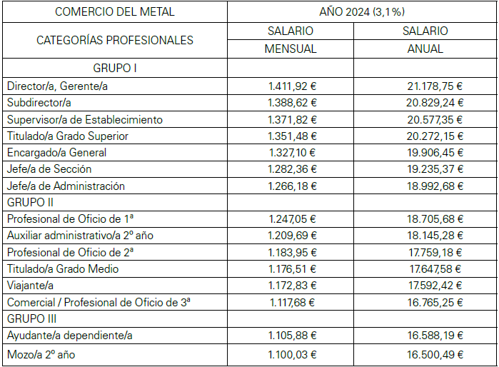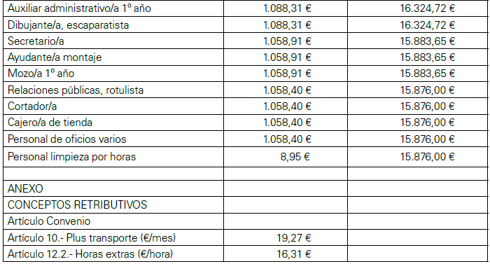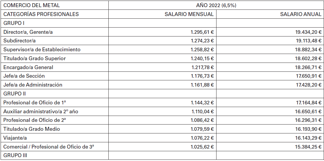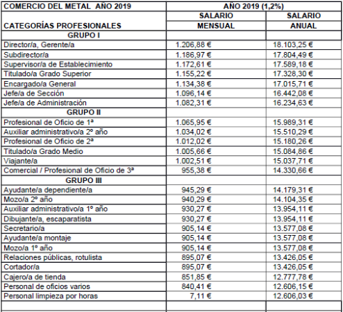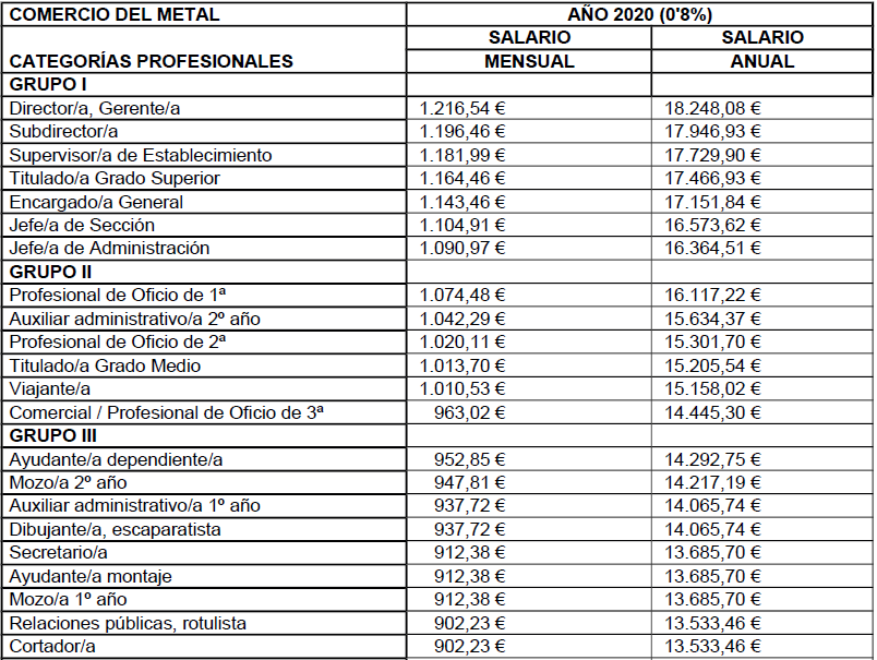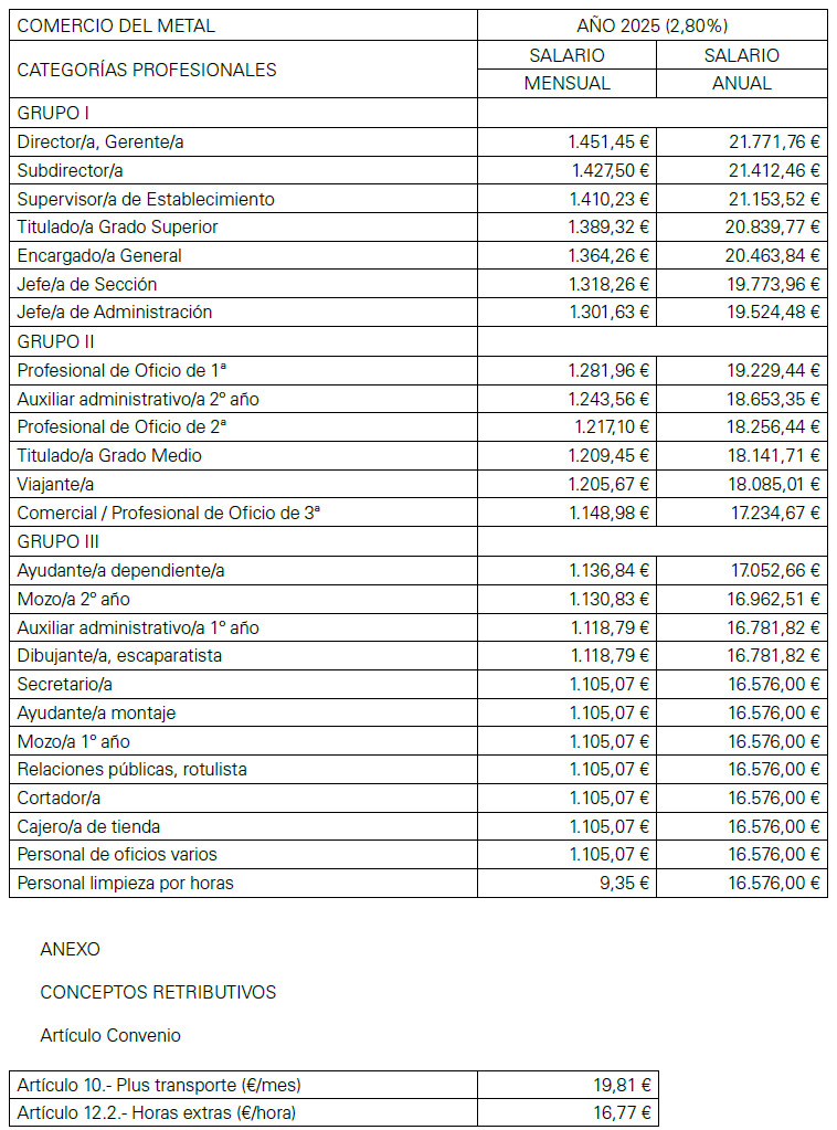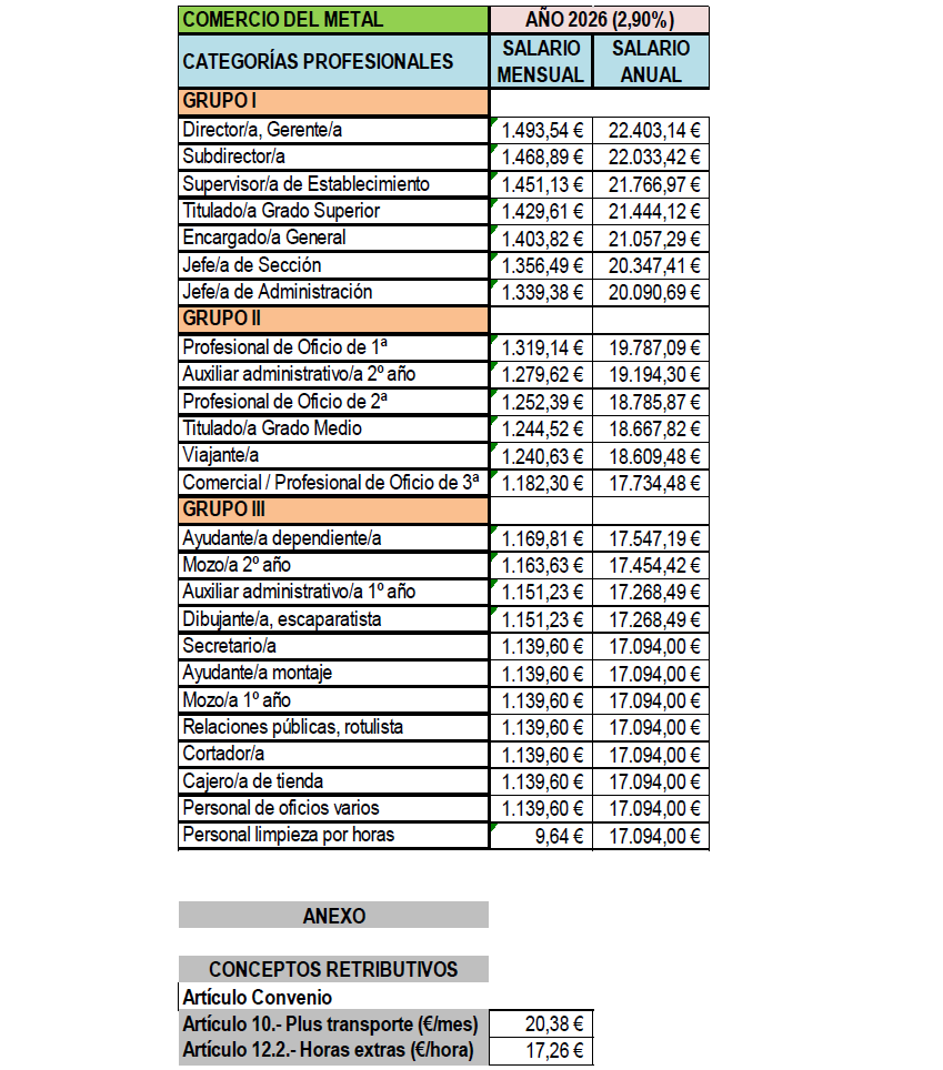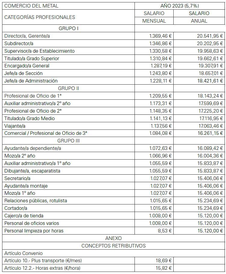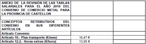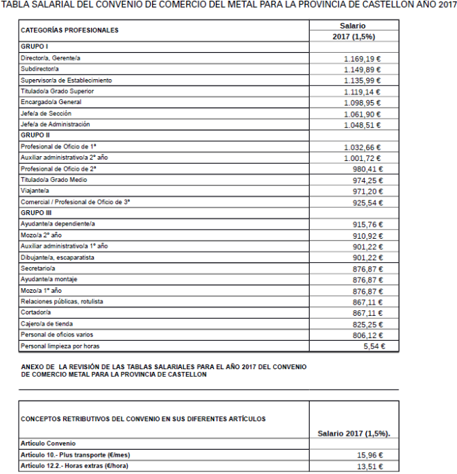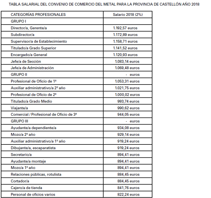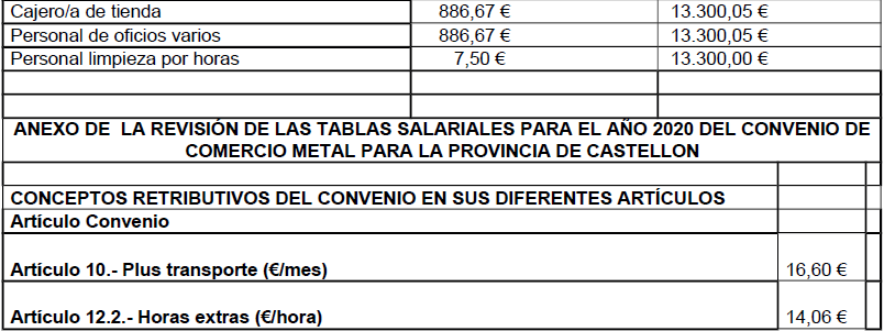 ANEXO DE LA REVISIÓN DE LAS TABLAS SALARIALES PARA EL AÑO 2018 DEL CONVENIO DE COMERCIO METAL PARA LA PROVINCIA DE CASTELLON
