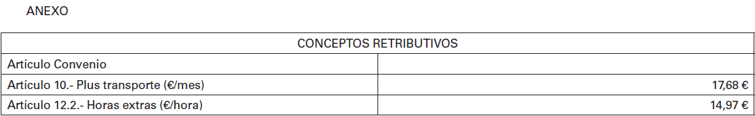 Se establece un plus de transporte consistente en la percepción por parte del trabajador/a de 15,60 euros por mes trabajado, incluyendo los puentes que pudieran establecerse. Este plus, que no se percibirá en Vacaciones ni situación de IT, sufrirá los aumentos porcentuales anuales previstos en este convenio para los restantes años de vigencia del mismo.