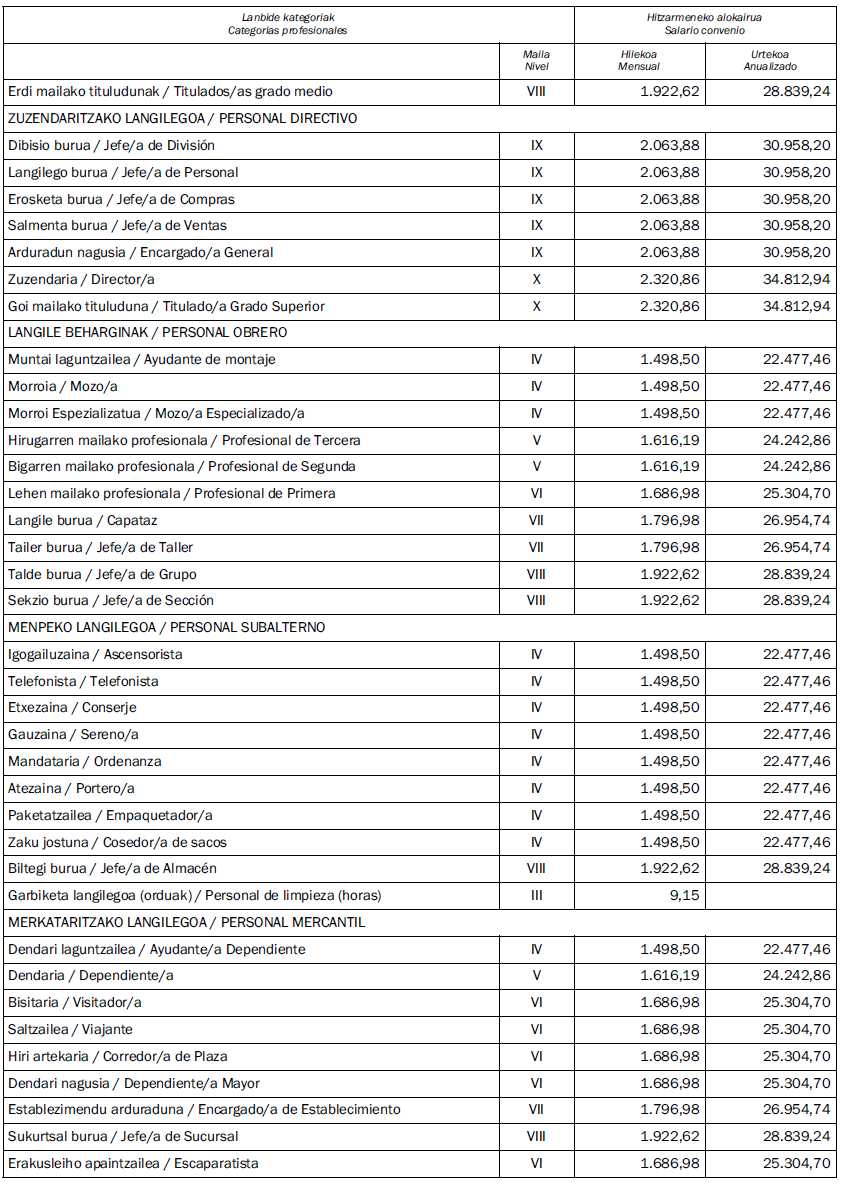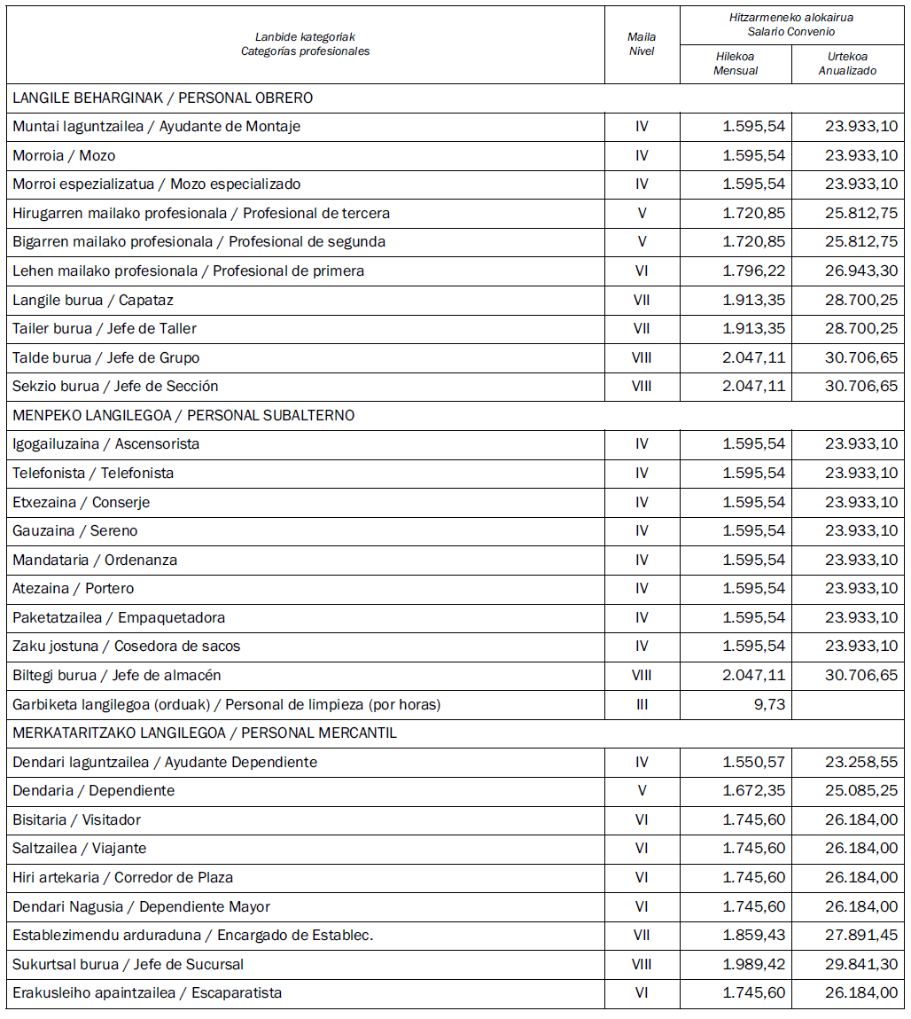 PRIMERO: Proceder a la corrección de los errores apreciados en el anexo I de las Tablas salariales. Se anexan las tablas a la presente acta, para su registro y publicación en el Boletín Oficial de Gipuzkoa.