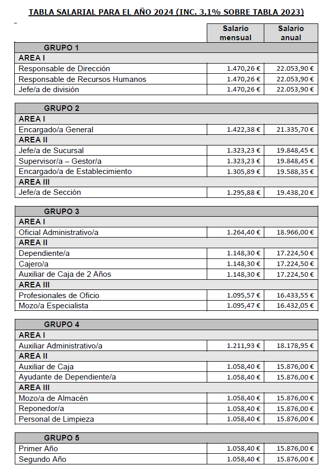 Ambas representaciones acuerdan efectuar la actualización de las tablas salariales para el año 2024, prevista en el artículo 19 del convenio colectivo. Para ello, se procede a aumentar las vigentes a 31 de diciembre de 2023 en el porcentaje equivalente al IPC real estatal del año 2023, lo que supone un incremento del 3,1% Se firman las tablas salariales que se adjuntan anexas a la presente acta.