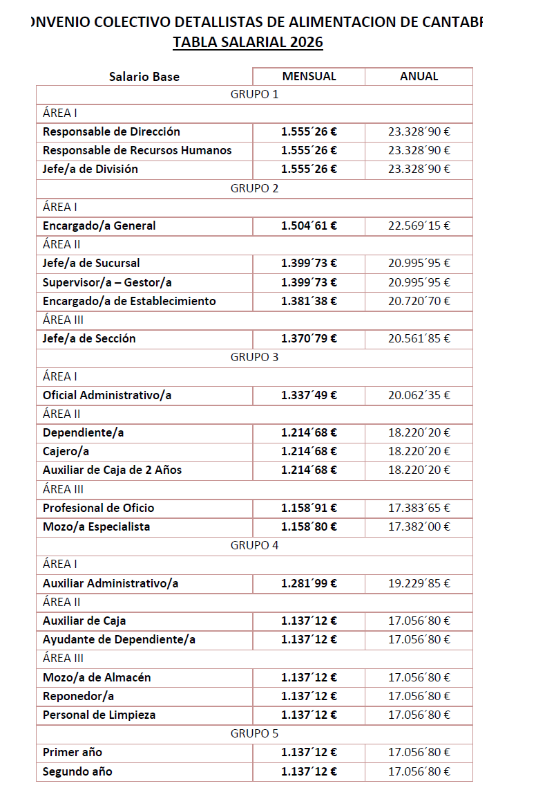Visto el Acuerdo suscrito con fecha 13 de marzo de 2026 por la Comisión Negociadora del Convenio Colectivo del sector del comercio de detallistas de alimentación de Cantabria, integrada por los sindicatos CCOO, Sindicato Unitario y UGT, en representación de las personas trabajadoras incluidas en el ámbito de aplicación del convenio, y por la Asociación Cántabra de Comerciantes de Alimentación y por UCEDA, en representación de la parte empresarial, por el que se adaptan las tablas salariales del año 2026, tras la publicación, el 19 de febrero de 2026, del salario mínimo interprofesional para el año 2026 (RD 126/2026, de 18 de febrero); y, de conformidad con el artículo 90 del Real Decreto Legislativo 2/2015, de 23 de octubre, por el que se aprueba el Texto Refundido de la Ley del Estatuto de los Trabajadores, y según lo dispuesto en los artículos 2 y 8 del Real Decreto 713/2010, de 28 de mayo, sobre Registro y Depósito de los Convenios Colectivos, Acuerdos Colectivos de Trabajo y Planes de Igualdad; y, en relación con lo señalado en el Real Decreto 1900/1996, de 2 de agosto, sobre traspaso de funciones y servicios de la Administración del Estado a la Comunidad Autónoma de Cantabria, así como en el Decreto 54/2023, de 20 de julio, por el que se modifica parcialmente la Estructura Orgánica Básica de las Consejerías del Gobierno de Cantabria,