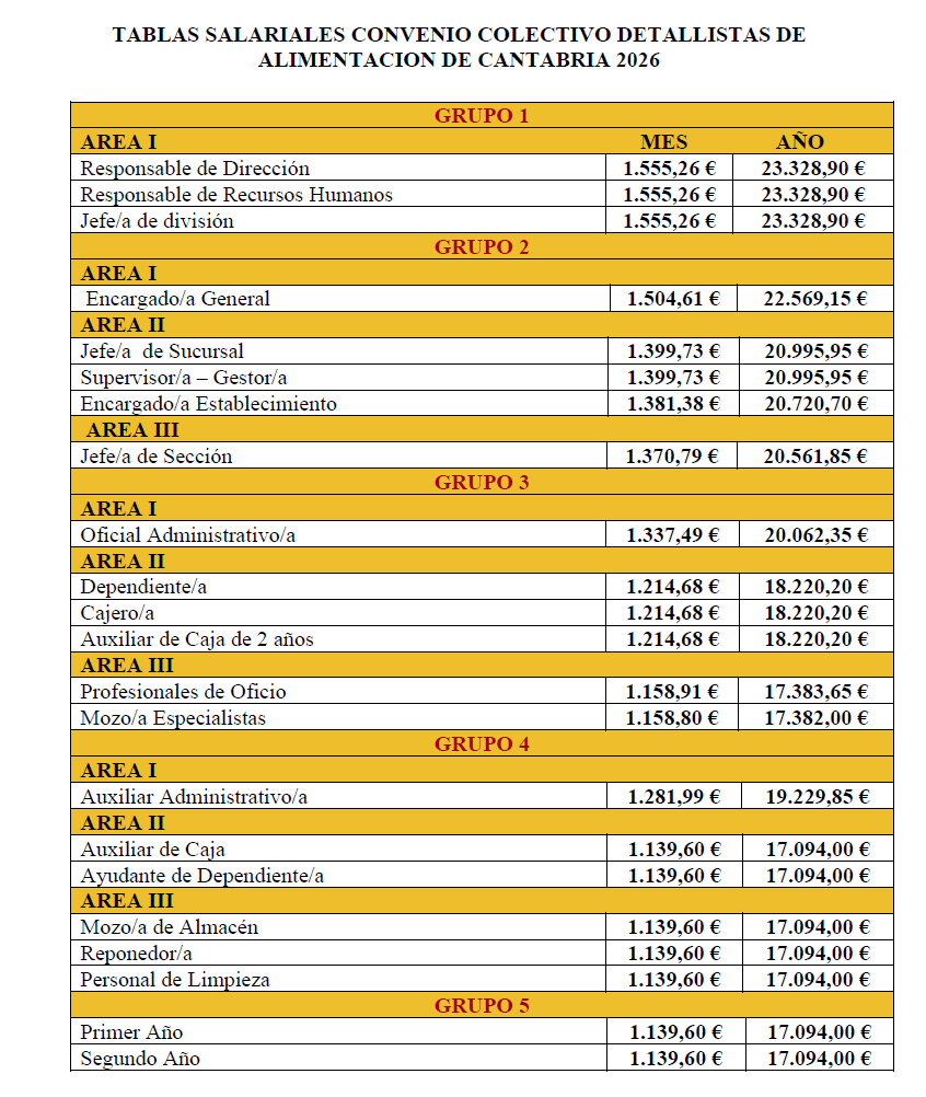 Resolución disponiendo la inscripción en el Registro y publicación del Acuedo suscrito por la Comisión Negociadora del Convenio Colectivo de Detallistas de Alimentación de Cantabria, por el que se actualizan las tablas salariales para 2026.
