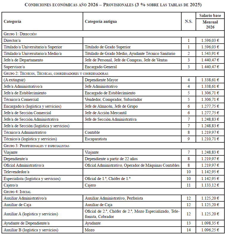 Año 2026: Al resultado del incremento del párrafo anterior (si procediese), se aplicará un incremento del 3 % sobre todos los conceptos económicas para todas las categorías profesionales.