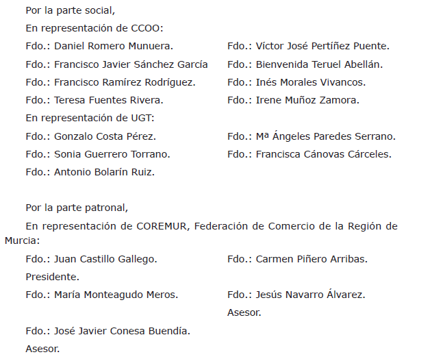 Se reúnen las personas que figuran a continuación, miembros de la Comisión Paritaria del Convenio Colectivo de Comercio en General de la Región de Murcia, en las correspondientes respresentaciones: