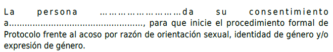 Cuando la denuncia o queja no sea presentadas directamente por la persona afectada, se deberá incluir su consentimiento expreso e informado de esta para iniciar las actuaciones del protocolo. (anexo II).