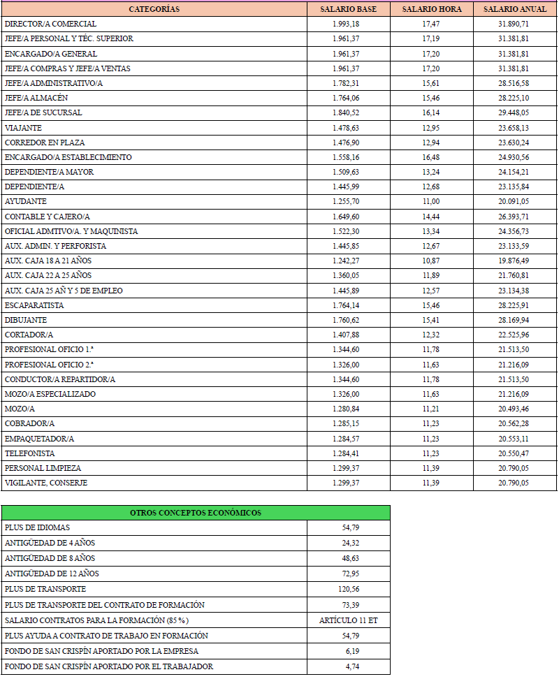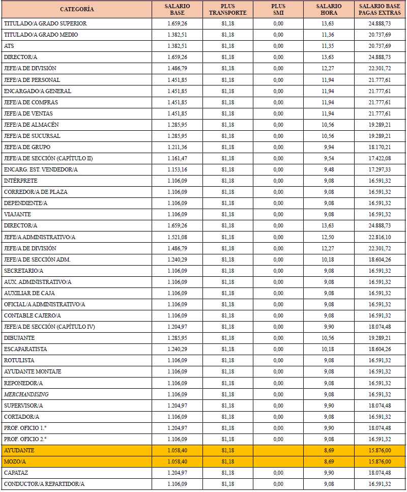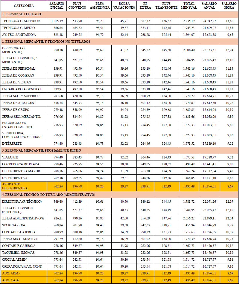 – Dependiente/a (esta categoría tendrá una subida adicional ante la igualdad de la categoría inferior de Ayudante de Dependiente, de 11,36 en el salario inicial (800 euros).