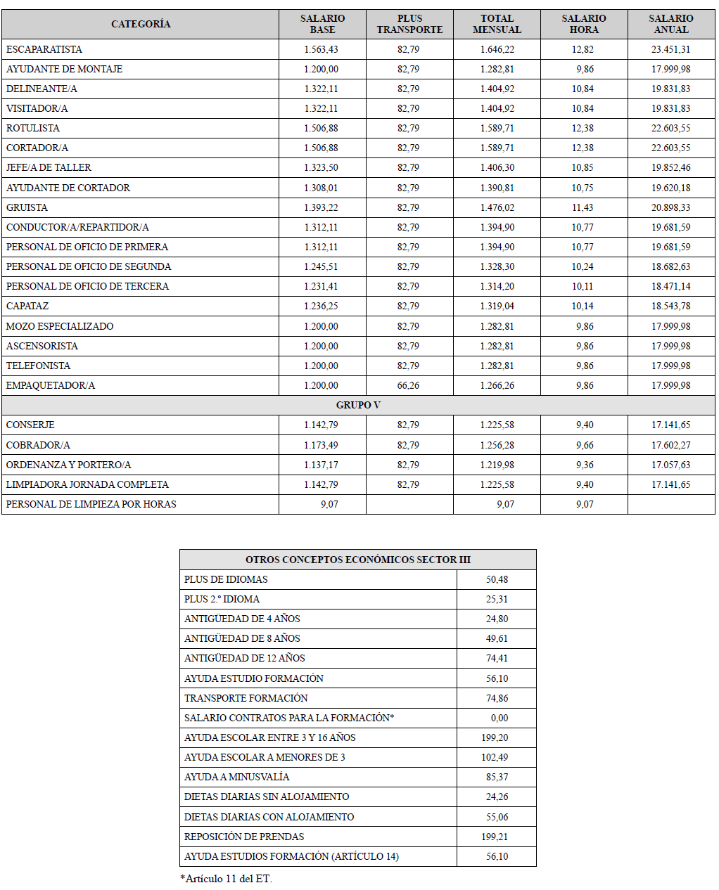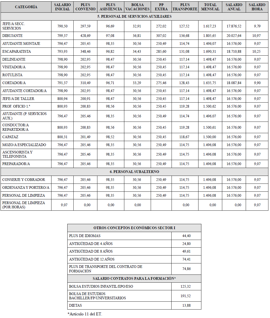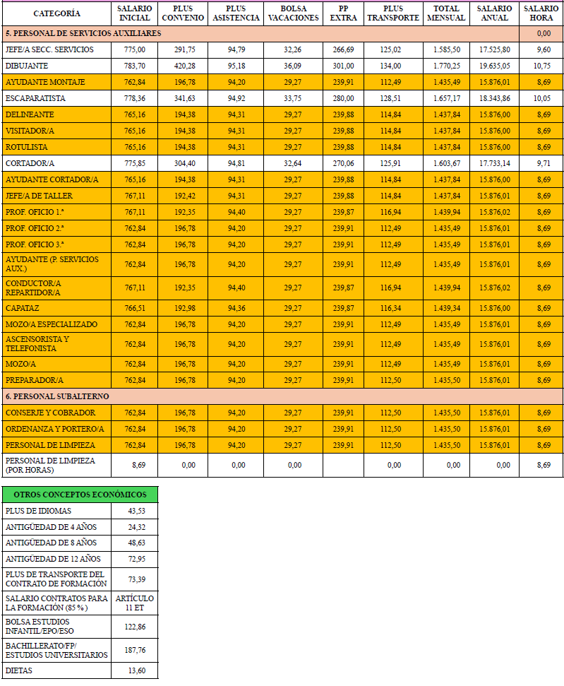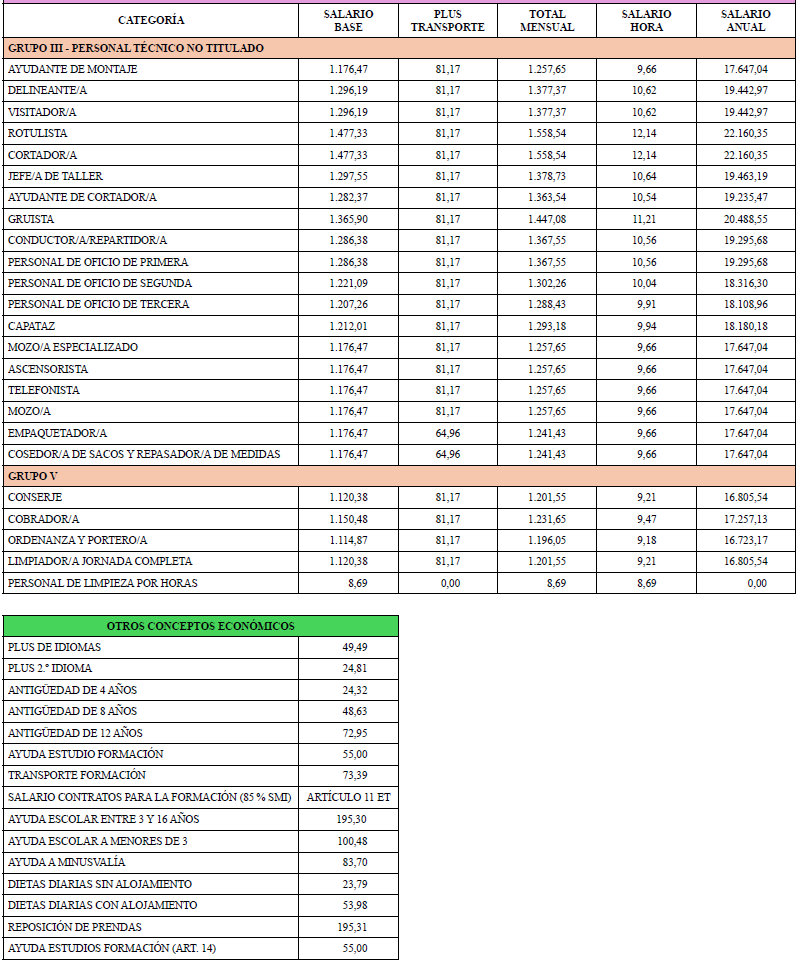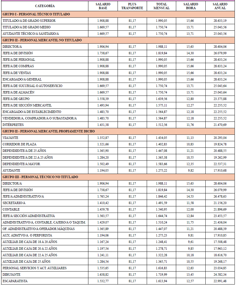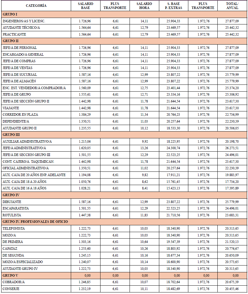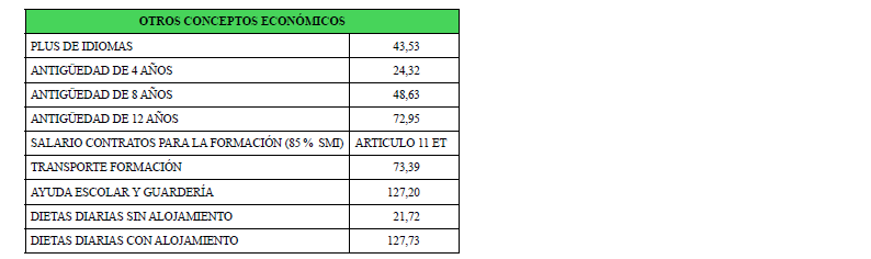 En concepto de plus de transporte, se percibirán la cantidad de (ver tablas salariales) euros mensuales para cada categoría profesional que se especifica en la segunda columna de la tabla de salario.