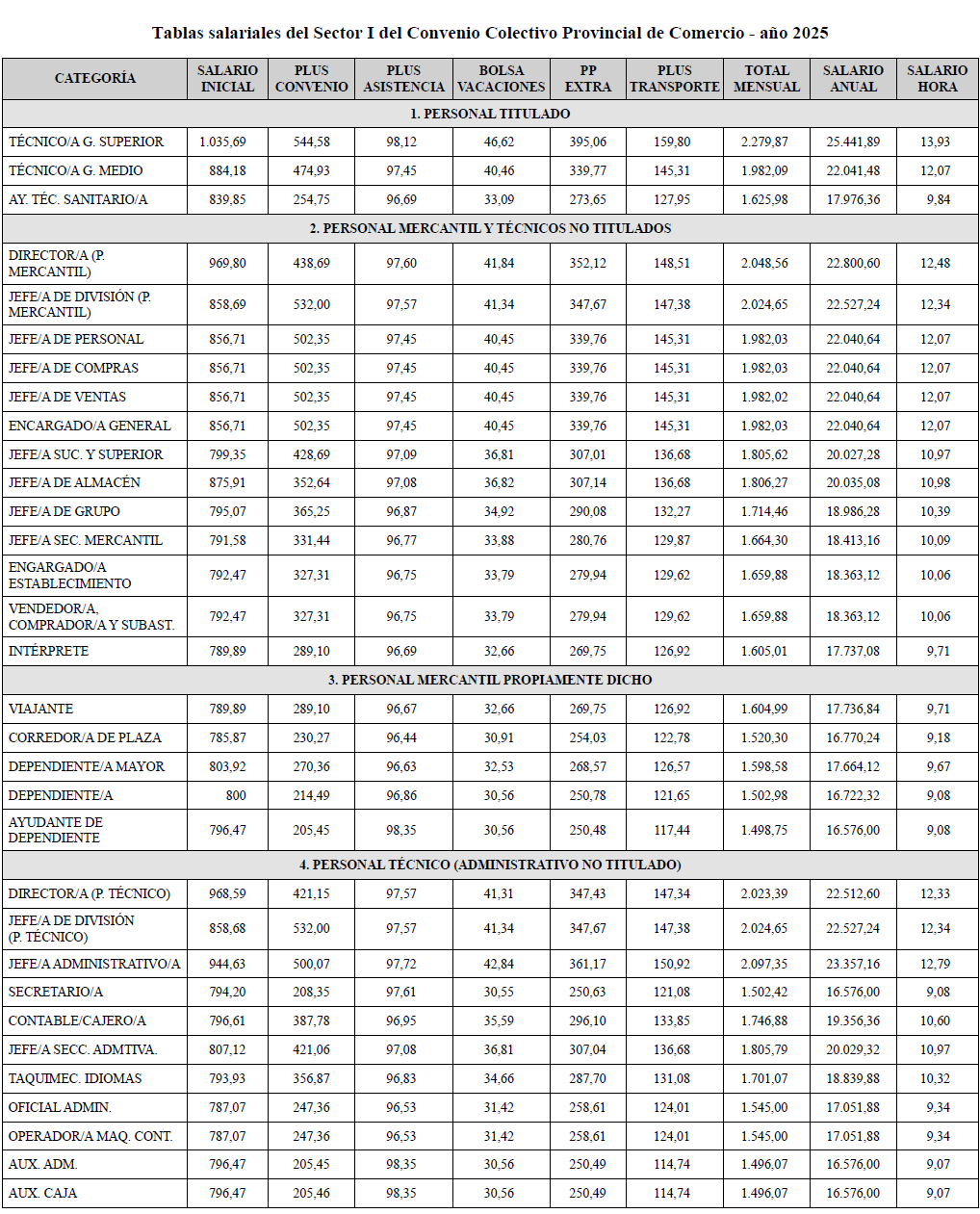 TABLAS SALARIALES DEL SECTOR I DEL CONVENIO COLECTIVO PROVINCIAL DE COMERCIO – AÑO 2024.