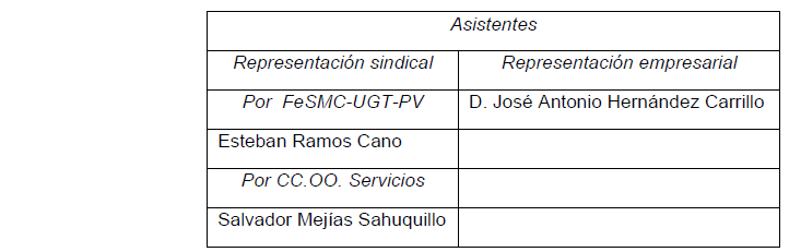 Y sin más asuntos que tratar, se levanta la sesión, de cuyo contenido da cuenta la presente acta, que es firmada en prueba de conformidad por una persona de cada representación, siendo las 11.00 horas del día indicado.