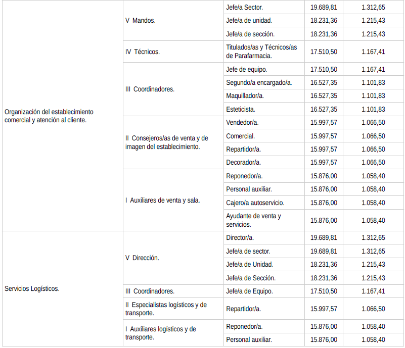 En la página 34800, deben modificarse las cuantías del apartado IV. Técnicos, Titulados/as y Técnicos/as de Parafarmacia sustituyendo «18.869,46/1.257,97» por «18.123,36/1.208,27».