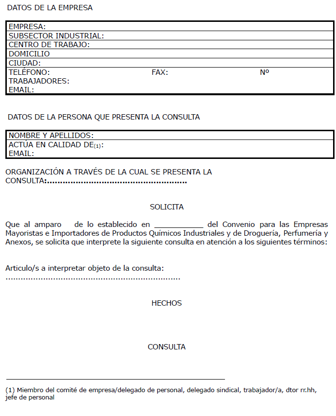 ANEXO III.- Modelo a rellenar para consultas a la comisión mixta del Convenio colectivo para las empresas mayoristas e importadores de productos químicos industriales y de droguería, perfumería y anexos