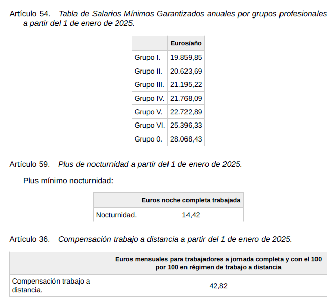 Igualmente se confirman para el año 2025 las tablas de Salarios Mínimos Garantizados del artículo 54 del convenio, así como el plus de nocturnidad del artículo 59, la compensación de trabajo a distancia del artículo 36 y los valores de viajes y dietas del artículo 65 establecidos todos ellos en el texto del convenio colectivo.