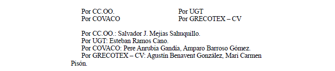 El presente Convenio Colectivo se ha pactado por la representación empresarial integrada por el Gremio de Comerciantes Textiles, Moda y Complementos de la Comunitat Valenciana (GRECOTEX) y la Confederación de Comerciantes y Autónomos de la Comunitat Valenciana (COVACO-Textil), y por la representación de las persones trabajadoras, integrada por los sindicatos Federación de Servicios, Movilidad y Consumo de UGT País Valenciano (FeSMC-UGT) y Federación de Servicios de CC.OO. del País Valenciano. (SERVICIOS-CCOO). Ambas partes se reconocen mutuamente legitimación para la negociación del presente convenio y para suscribirlo en los términos que constan como norma de eficacia general.